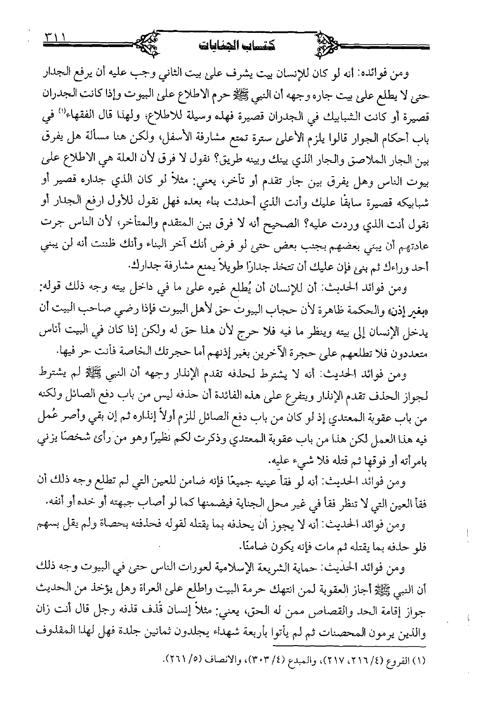ومن فوائده: أنه لو كان للإنسان بيت يشرف على بيت الثاني وجب عليه أن يرفع الجدار حتى لا يطلع على بيت جاره وجهه أن النبي صلى الله عليه وسلم حرم الاطلاع على البيوت وإذا كانت الجدران قصيرة أو كانت الشبابيك في الجدران قصيرة فهذه وسيلة للإطلاع؛ ولهذا قال الفقهاء في باب أحكام الجوار قالوا يلزم الأعلى سترة تمنع مشارفة الأسفل، ولكن هنا مسألة هل يفرق بين الجار الملاصق والجار الذي بينك وبينه طريق؟ نقول لا فرق لأن العلة هي الاطلاع على بيوت الناس وهل يفرق بين جار تقدم أو تأخر، يعني: مثلاً لو كان الذي جداره قصير أو شبابيكه قصيرة سابقًا عليك وأنت الذي أحدثت بناء بعده فهل نقول للأول أرفع الجدار أو تقول أنت الذي وردت عليه؟ الصحيح انه لا فرق بين المتقدم والمتأخر، لأن الناس جرت عادتهم أن يبني بعضهم بجنب بعض حتى لو فرض أنك آخر البناء وأنك ظننت أنه لن يبني أحد وراءك ثم بنى فإن عليك أن تتخذ جدارًا طويلاً يمنع مشارفة جدارك.