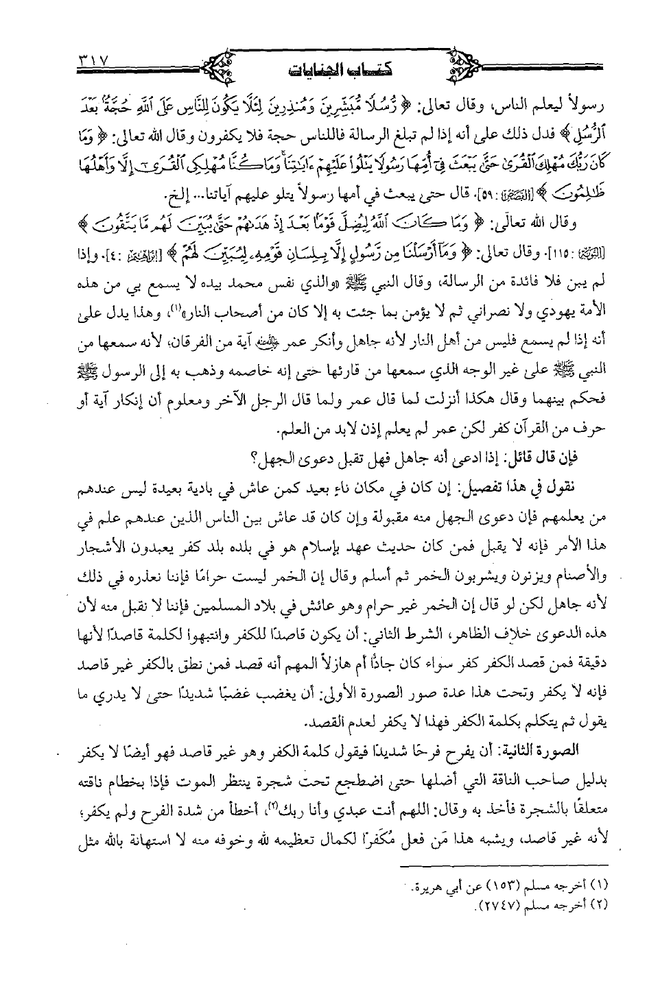 وقال الله تعالى: (وما كان الله ليضل قوما بعد غذ هداهم حتَّى يبين لهم ما يتقون) [التوبة: 115]، وقال تعالى: (وما أرسلنا من رسولٍ إلا بلسان قومه ليبين لهم) [إبراهيم: 4]، وإذا لم يبن فلا فائدة من الرسالة، وقال النبي صلى الله عليه وسلم "والذي نفس محمد بيده لا يسمع بي من هذه الأمة يهودي ولا نصراني ثم لا يؤمن بما جئت به إلا كان من أصحاب النار"، وهذا يدل على أنه إذا لم يسمع فليس من أهل النار لأنه جاهل وأنكر عمر رضي الله عنه آية من الفرقان؛ لأنه سمعها من النبي صلى الله عليه وسلم على غير الوجه الذي سمعها من قارئها حتى إنه خاصمه وذهب به إلى الرسول صلى الله عليه وسلم فحكم بينهما وقال هكذا أنزلت لما قال عمر ولما قال الرجل الآخر ومعلوم أن إنكار آية أو حرف من القرآن كفر لكن عمر لم يعلم إذن لابد من العلم.