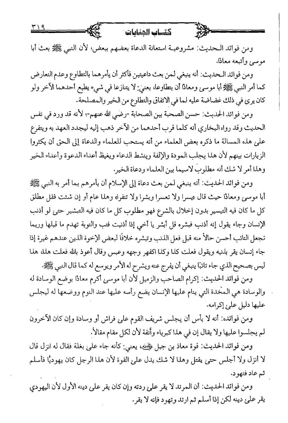 ومن فوائد الحديث: أنه ينبغي لمن بعث دعاة إلى الإسلام أن يأمرهم بما أمر به النبي صلى الله عليه وسلم أبا موسى ومعاذاً حيث قال "يسرا ولا تعسرا وبشرا ولا تنفرا" وهذا عام أو إن شئت فقل مطلق كل ما كان فيه التيسير بدون إخلال بالشرع فهو مطلوب كل ما كان فه التبشير حتى لو أذنب الإنسان وجاء يقول إنه أذنب فبشره قل أبشر يا أخي إذا أذنبت فتب والتوبة تهدم ما قبلها وربما تجعل التائب أحسن حالاً منه قبل قبل فعل الذنب وتبشره خلافًا لبعض الأخوة الذين عندهم غيره إذا جاء إنسان يقر بذنبه ويقول فعلت كذا وكذا اكفهر وجهه وعبس وقال أعوذ بالله فعلت هذا، هذا ليس بصحيح الذي جاء تائبًا ينبغي أن يفرج عنه ويشرح له الأمر ويوسع له كما قال النبي صلى الله عليه وسلم.