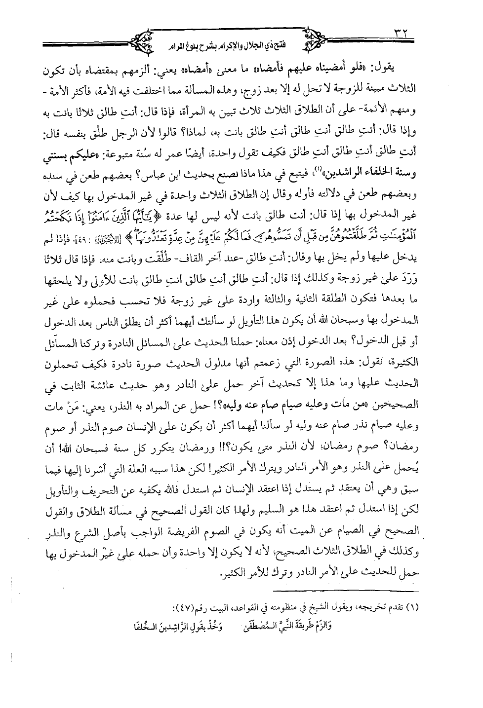 يقول: "فلو أمضيناه فأمضاه" ما معنى "أمضاه" يعني: ألزمهم بمقتضاه بأن تكون الثلاث مبينة للزوجة لا تحل له إلا بعد زوج، وهذه المسألة مما اختلف فيه الأمة، فأكثر الأمة- ومنهم الأئمة- على أن الطلاق الثلاث ثلاث تبين به المرأة، فإذا قال: أنت طالق ثلاثًا بانت به وإذا قال: أنت طالق أنت طالق أنت طالق بانت به، لماذا؟ قالوا لأن الرجل طلق بنفسه قال: أنت طالق أنت طالق أنت طالق فكيف تقول واحدة، أيضًا عمر له سنة متبوعة: "عليكم بسنتي وسنة الخلفاء الراشدين"، فيتبع في هذا ماذا نصنع بحديث ابن عباس؟ بعضهم طعن في سنده وبعضهم طعن في دلالته فأوله وقال إن الطلاق الثلاث واحدة في غير المدخول بها كيف لأن غير المدخول بها إذا قال: أنت طالق بانت لأنه ليس لها عدة {يأيها الذين أمنوا إذا نكحتم المؤمنات ثم طلقتموهن من قبل أن تمسوهن فما لكم عليهن من عدة تعتدونها} [الأحزاب: 49] فإذا لم يدخل عليها ولم يخل بها وقال: أنت طالق- عند آخر القاف- طلَّقت وبانت منه، فإذا قال ثلاثًا ورد على غير زوجة وكذلك إذا قال: أنت طالق أنت طالق أنت طالق بانت للأولى ولا يلحقها ما بعدها فتكون الطلقة الثانية والثالثة واردة على غير زوجة فلا تحسب فحملوه على غير المدخول بها وسبحان الله أن يكون هذا التأويل لو سألتك أيهما أكثر أن يطلق الناس بعد الدخول أو قبل الدخول؟ بعد الدخول إذن معناه: حملنا الحديث على المسائل النادرة وتركنا المسائل الكثيرة، نقول: هذه الصورة التي زعمتم أنها مدلول الحديث صورة نادرة فكيف تحملون الحديث عليها وما هذا إلا كحديث آخر حمل على النادر وهو حديث عائشة الثابت في الصحيحين "من مات وعليه صيام صام عنه وليه"؟ ! حمل عن المراد به النذر، يعني: من مات وعليه صيام نذر صام عنه وليه لو سألنا أيهما أكثر أن يكون على الإنسان صوم النذر أو صوم رمضان؟ صوم رمضان؛ لأن النذر متى يكون؟ ! ! ورمضان يتكرر كل سنة فسبحان الله! أن يحمل على النذر وهو الأمر النادر ويترك الأمر الكثير! لكن هذا سببه العلة التي أشرنا إليها فيما سبق وهي أن يعتقد ثم يستدل إذا اعتقد الإنسان ثم استدل فالله يكفيه عن التحريف والتأويل لكن إذا استدل ثم اعتقد هذا هو السليم ولهذا كان القول الصحيح في مسالة الطلاق والقول الصحيح في الصيام عن الميت أنه يكون في الصوم الفريضة الواجب بأصل الشرع والنذر وكذلك في الطلاق الثلاث الصحيح؛ لأنه لا يكون إلا واحدة وأن حمله على غير المدخول بها حمل للحديث على الأمر النادر وترك للأمر الكثير.