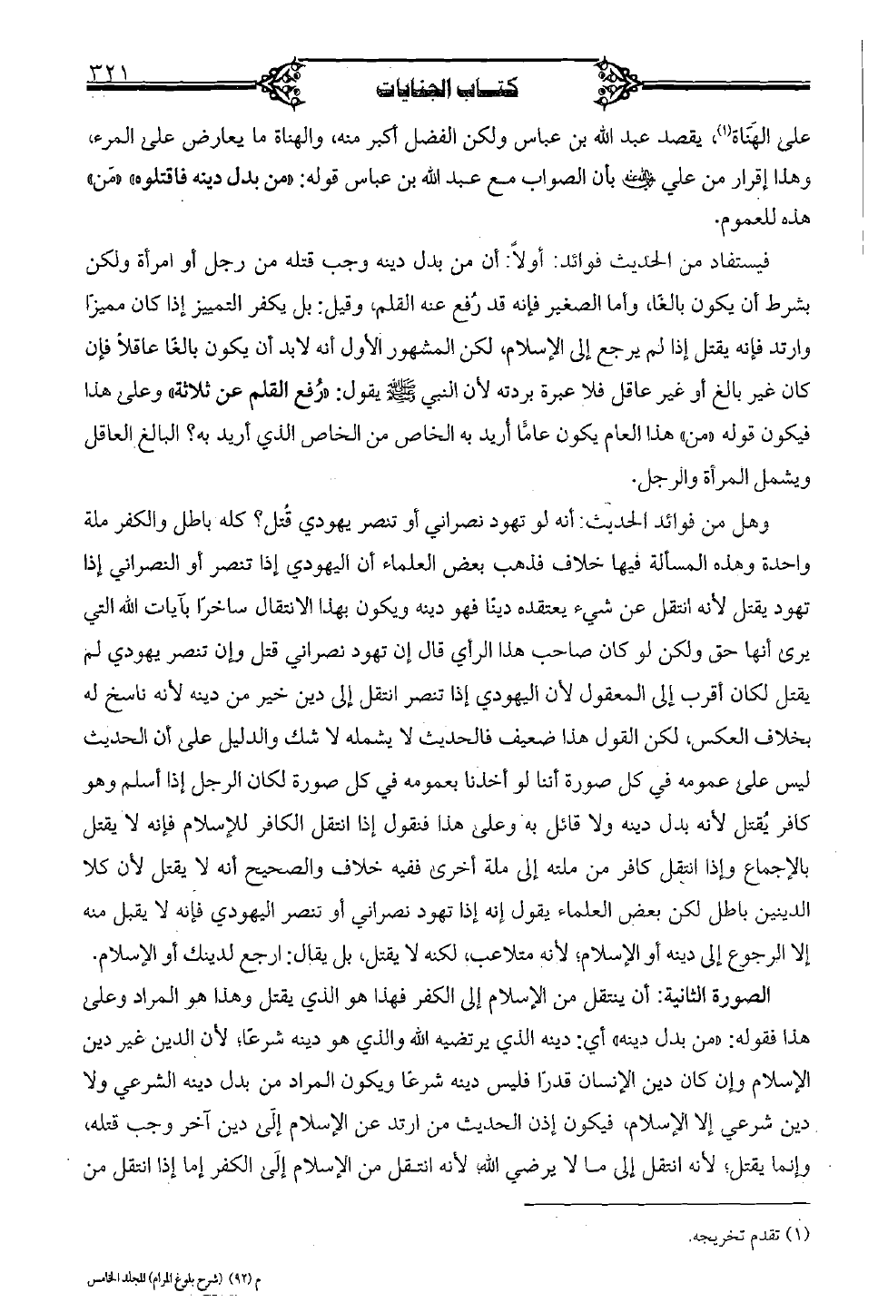 وهل من فوائد الحديث: أنه لو تهود نصراني أو تنصر يهودي قُتل؟ كله باطل والكفر ملة واحدة وهذه المسألة فيها خلاف فذهب بعض العلماء أن اليهودي إذا تنصر أو النصراني إذا تهود يقتل لأنه انتقل عن شيء يعتقده دينًا فهو دينه ويكون بهذا الانتقال ساخرًا بآيات الله التي يرى أنها حق ولكن لو كان صاحب هذا الرأي قال إن تهود نصراني قتل وإن تنصر يهودي لم يقتل لكان اقرب إلى المعقول لأن اليهودي إذا تنصر إلى دين خير من دينه لأنه ناسخ له بخلاف العكس، لكن القول هذا ضعيف فالحديث لا يشمله لا شك والدليل على أن الحديث ليس على عومه من كل صورة أننا لو أخذنا بعمومه في كل صورة لكان الرجل إذا أسلم وهو كافر يُقتل لأنه بذل دينه ولا قائل به وعلى هذا فنقول إذا انتقل الكافر للإسلام فإنه لا يقتل بالإجماع وإذا انتقل كافر من ملته إلى ملة أخرى ففيه خلاف والصحيح أنه لا يقتل لأن كلا الدينين باطل لكن بعض العلماء يقول إنه إذا تهود نصراني أو تنصر اليهودي فإنه لا يقبل منه إلا الرجوع إلى دينه أو الإسلام؛ لأنه متلاعب، لكنه لا يقتل، بل يقال: ارجع لدينك أو الإسلام.