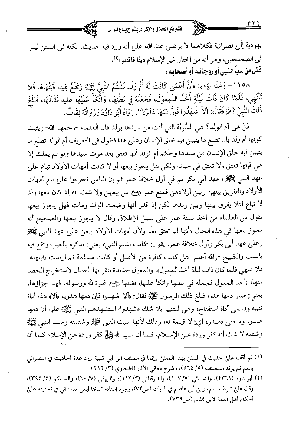 1158 - وعنه رضى الله عنه: "أن أعمى كانت له أم ولد تشتم النبي صلى الله عليه وسلم وتقع فيه، فينهاها فلا تنتهي، فلما كان ذات ليلة أخذ المعول، فجعله في بطنها، واتكأ عليها عليه فقتلها، فبلغ ذلك النبي صلى الله عليه وسلم فقال: ألا اشهدوا فإن دمها هدرٌ". رواه أبو داود ورواته قاتٌ.