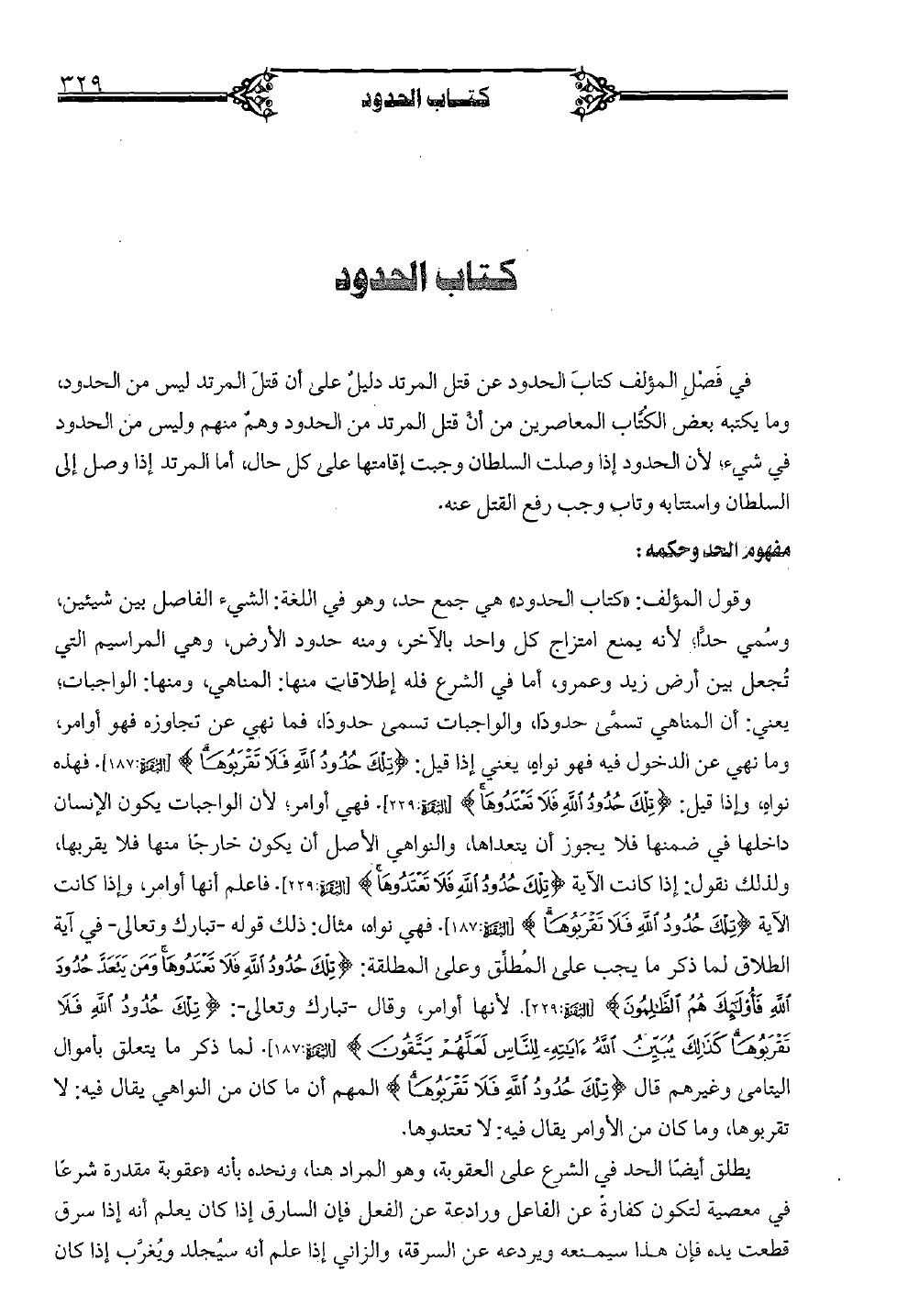 وقول المؤلف: "كتاب الحدود" هي جمع حد، وهو في اللغة: الشيء الفاصل بين شيئين، وسمي حدًّا؛ لأنه يمنع امتزاج كل واحد بالآخر، ومنه حدود الأرض، وهي المراسيم التي تُجعل بين أرض زيد وعمرو، أما في الشرع فله إطلاقات منها: المناهي، ومنها: الواجبات؛ يعني: أن المناهي تسمَّى حدودًا، والوجبات تسمى حدودًا، فما نهي عن تجاوزه فهو أوامر، وما نهي عن الدخول فهو نواه، يعني إذا قيل: {تلك حدود الله فلا تقربوها} [البقرة: 187]، فهذه نواه، وإذا قيل: {تلك حدود الله فلا تعتدوها} [البقرة]، فهي أوامر، لأن الواجبات يكون الإنسان داخلها في ضمنها فلا يجوز أن يتعداها، والنواهي الأصل أن يكون خارجًا منها يقربها، ولذلك نقول: إذا كانت الآية {تلك حدود الله فلا تعتدوها} [البقرة: 229]، فاعلم أنها أوامر، وإذا كانت الآية {تلك حدود الله فلا تقربوها} [البقرة: 187]، فهي نواه، مثال ذلك قوله- تبارك وتعالى- في آية الطلاق لما ذكر ما يجب على المُطلِّق وعلى المطلقة: {تلك حدود الله فلا تعتدوها ومن يتعد حدود الله فأولئك هم الظالمون} [البقرة: 229]، لأنها أوامر، وقال- تبارك وتعالى-: {تلك حدود الله فلا تقربوها كذلك يبين الله آياته للنّاس لعلهم يتقون}، لما ذكر ما يتعلق بأموال اليتامى وغيرهم قال {تلك حدود الله فلا تقربوها} المهم أن ما كان من النواهي يقال فيه: لا تقربوها، وما كان من الأوامر يقال فيه: لا تعتدوها.