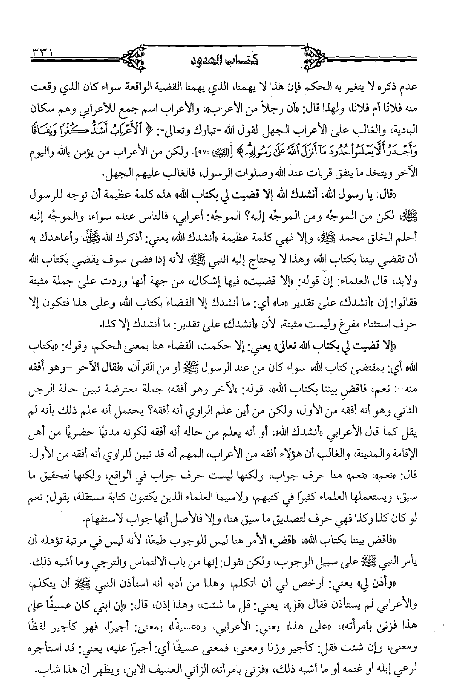 "قال: لكن من الموجّه ومن الموجَّه إليه؟ الموجّه: أعرابي، فالناس عنده سواء، والموجَّه إليه أحلم الخلق محمد صلى الله عليه وسلم، وإلا فهي كلمة عظيمة "أنشدك الله" يعني: أذكرك الله عز وجل وأعاهدك به أن تقضي بيننا بكتاب الله، وهذا لا يحتاج إليه النبي صلى الله عليه وسلم؛ لأنه إذا قضى سوف يقضي بكتاب الله ولا بد، قال العلماء: إن قوله: "إذا قضيت" فيها إشكال، من جهة أنها وردت على جملة مثبتة فقالوا: إن "أنشدك" على تقدير "ما" أي: ما أنشدك إلا القضاء بكتاب الله، وعلى هذا فتكون إلا حرف استثناء مفرغ وليست مثبتة؛ لأنه "أنشدك" على تقدير: ما أنشدك إلا كذا.