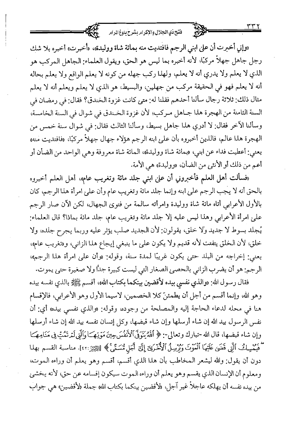 وإن أخبرت أن على ابني الرجم فافتديت منه بمائة شاة ووليدة"، "أُخبرت" أخبره بلا شك رجل جاهل جهلًا مركبًا؛ لأنه أخبره بما ليس هو الحق، ويقول العلماء: الجاهل المركب هو الذي لا يعلم ولا يدري أنه لا يعلم، ولهذا ركب جهله من كونه لا يعلم الواقع ولا يعلم بحاله أنه لا يعلم فهو في الحقيقة مركب من جهلين، والبسيط هو الذي لا يعلم ويعلم أنه لا يعلم مثال ذلك: ثلاثة رجال سألنا أحدهم فقلنا له: متى كانت غزوة الخندق؟ فقال: في رمضان في السنة الثامنة من الهجرة هذا جاهل مركب؛ لأن غزوة الخندق في شوال في السنة الخامسة، وسألنا الآخر فقال: لا أدري هذا جاهل بسيط، وسألنا الثالث قال: في شوال سنة خمس من الهجرة هذا عالم، فالذين أخبروه بأن على ابنه الرجم هؤلاء جهال جهلًا مركبًا، "فافتديت منه" يعني: أعطيت فداء عن ابني، "بمائة شاة ووليدة"، المائة شاة معروفة وهي الواحد من الضأن أو أعم من ذلك أو الأنثى من الضأن، "ووليدة" هي الأمة.