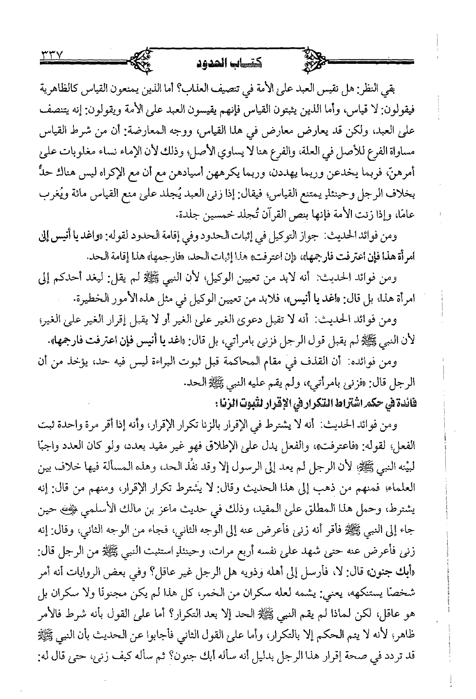 ومن فوائد الحديث: أنه لا يشترط في الإقرار بالزنا تكرار الإقرار، وأنه إذا أقر مرة واحدة ثبت الفعل؛ لقوله: "فاعترفت"، والفعل يدل على الإطلاق فهو غير مقيد بعدد، ولو كان العدد واجبًا لبينة النبي صلى الله عليه وسلم؛ لأن الرجل لم يعد إلى الرسول إلا وقد نفّذ الحد، وهذه المسألة فيها خلاف بين العلماء، فمنهم من ذهب إلى هذا الحديث وقال: لا يشترط تكرار الإقرار، ومنهم من قال: إنه يشترطن وحمل هذا المطلق على المقيد، وذلك في حديث ماعز بن مالك الأسلمي رضي الله عنه حين جاء إلى النبي صلى الله عليه وسلم فأقر أنه زنى فأعرض عنه إلى الوجه الثاني، فجاء من الوجه الثاني، وقال: إنه زني فأعرض عنه حتى شهد على نفسه أربع مرات، وحينئذٍ استثبت النبي صلى الله عليه وسلم من الرجل قال: "أبك جنون" قال: لا، فأرسل إلى أهله وذرية هل الرجل غير عاقل؟ وفي بعض الروايات أنه أمر شخصًا يستنكهه، يعني: يشمه لعله سكران من الخمر، كل هذا لم يكن مجنونًا ولا سكران بل هو عاقل، لكن لماذا لم يقم النبي صلى الله عليه وسلم الحد إلا بعد التكرار؟ أما على القول بأنه شرط فالأمر ظاهر؛ لأنه لا يتم الحكم إلا بالتكرار، وأما على القول الثاني فأجابوا عن الحديث بأن النبي صلى الله عليه وسلم قد تردد في صحة إقرار هذا الرجل بدليل أنه سأله أبك جنون؟ ثم سأله كيف زني، حتى قال له: