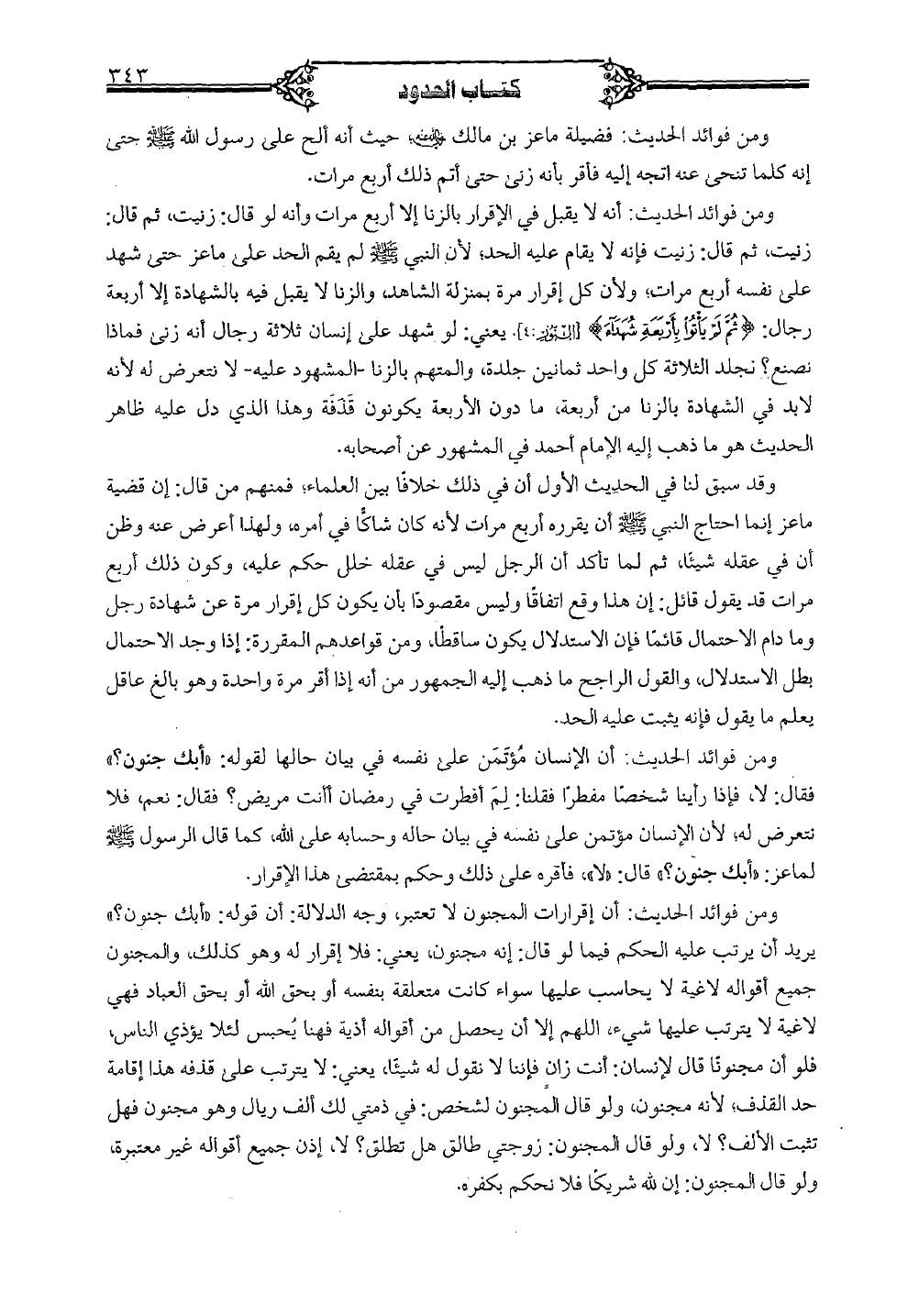 ومن فوائد الحديث: أن إقرارات المجنون لا تعتبر، وجه الدلالة: أن قوله: أبك جنون؟ " يريد أن يرتب عليه الحكم فيما لو قال: إنه مدجنون، يعني: فلا إقرار له وهو كذلك، والمجنون جميع أقواله لاغية لا يحاسب عليها سواء كانت متعلقة بنفسه أو بحق الله أو بحق العباد فهي لاغية لا يترتب عليها شيء، اللهم إلا أن يحصل من أقواله أذية فهنا يحبس لئلا يؤذي الناس، فلو أن مجنونًا قال لإنسان: أنت زانٍ فإننا لا نقول له شيئًا، يعني: لا يترتب على قذفه هذا إقامة حد القذف؛ لأنه مجنون، ولو قال المجنون لشخص: في ذمتي لك ألف ريال وهو مجنون فهل تثبت الألف؟ لا، ولو قال المجنون: زوجتي طالق هل تطلق؟ لا، إذن جميع أقواله غير معتبرة، ولو قال المجنون: إن الله شريكًا فلا نحكم بكفره.