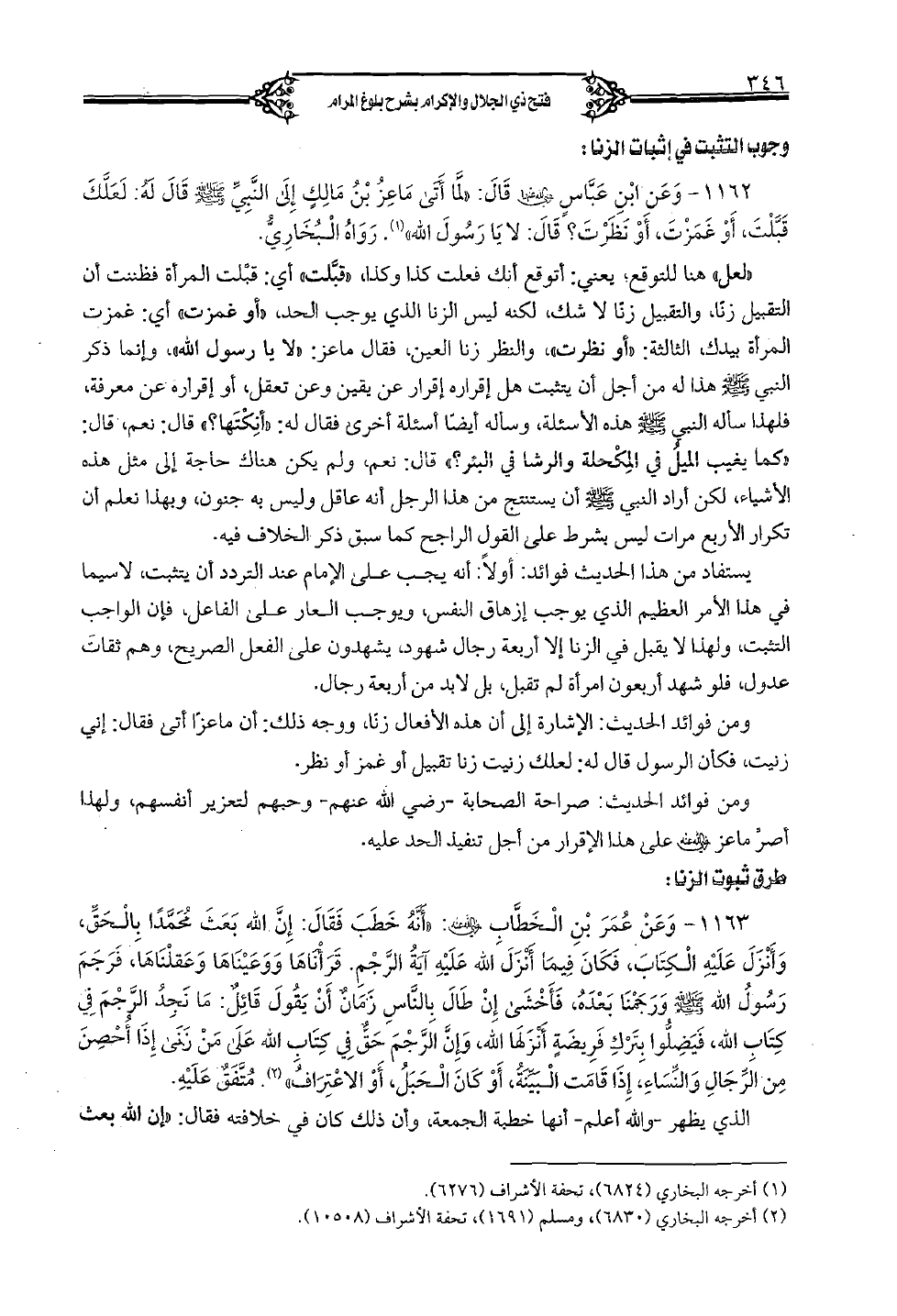1163 - وعن عمر بن الخطَّاب رضي الله عنه: "أنَّه خطب فقال: إنَّ الله بعث محمَّدًا بالحقِّ، وأنزل عليه الكتاب، فكان فيما أنزل الله عليه آية الرَّجم. قرأناها ووعيناها وعقلناها، فرجم رسول الله صلى الله عليه وسلم ورجمنا بعده، فأخشى إن طال بالنَّاس زمانٌ ان يقول قائلٌ: ما نجد الرَّجم في كتاب الله، على من زنى إذا أحصن من الرِّجال والنِّساء، إذا قامت البيِّنة، أو كان الحبل، أو الاعتراف". متَّفقٌ عليه.