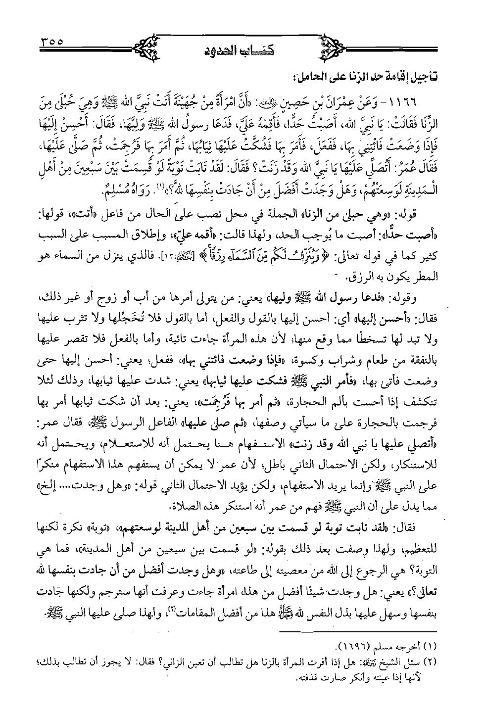 1166 - وعن عمران بن حصينٍ رضي الله عنه: "أنَّ امرأةً من جهينة أتت نبيَّ الله صلى الله عليه وسلم وهي حبلى من الزِّنا فقالت: يا نبيَّ الله، أصبت حدًّا، فأقمه عليَّ، فدعا رسول الله صلى الله عليه وسلم وليَّها، فقال: أحسن إليها فإذا وضعت فائتني بها، ففعل، فأمر بها فشكَّت عليها ثيابها، ثمَّ أمر بها فرجمت، ثمَّ صلَّى عليها، فقال عمر: أتصلِّي عليها يانبيَّ الله وقد زنت؟ فقال: لقد تابت توبةً لو قسمت بين سبعين من أهل المدينة لوسعتهم، وهل وجدت أفصل من أن جادت بنفسها لله؟ ". رواه مسلمٌ.