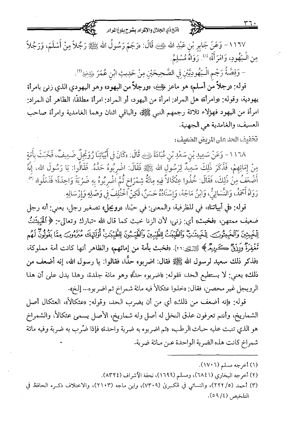 1168 - وعن سعيدٍ بن سعد بن عبادة رضي الله عنه قال: "كان في أبياتنا رويجلٌ ضعيفٌ، فخبث بأمةٍ من إمائهم، فذكر ذلك سعيدٌ لرسول الله صلى الله عليه وسلم فقال: اضربوه حدَّه. فقالوا: يا رسول الله، إنَّه أضعف من ذلك، فقال: خذوا عثكالًا فيه مائة شمراخ ثمَّ اضربوه به ضربةً واحدةً؛ ففعلوا". رواه أحمد، والنِّسائيُّ، وابن ماجه، وإسناده حسنٌ، لكن اختلف في وصله وإرساله.