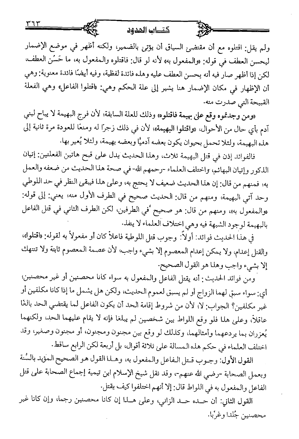 القول الأول: "جوب قتل الفاعل والمفعول به، وهذا القول هو الصحيح المؤيد بالسُّنة وبعمل الصحابة - رضي الله عنهم -، وقد نقل شيخ الإسلام ابن تيمية إجماع الصحابة على قتل الفاعل والمفعول به في اللواط قال: إلَّا أنهم اختلفوا كيف يقتل.
