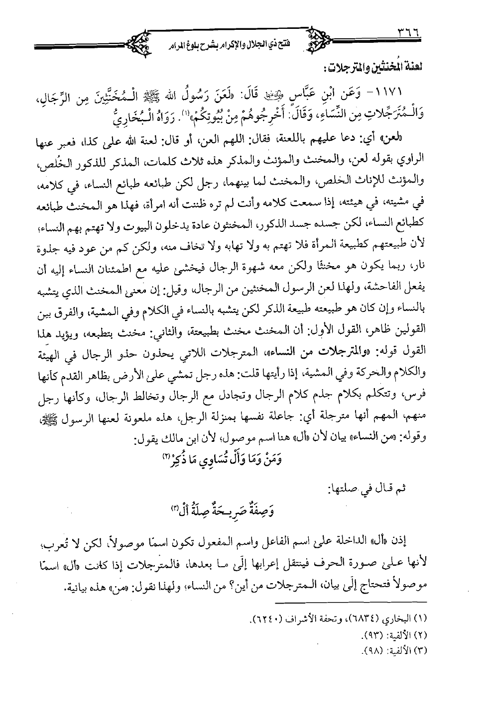 1171 - وعن ابن عبَّاسٍ رضي الله عنهما قال: "لعن رسول الله صلى الله عليه وسلم المخنَّثين من الرِّجال، والمترجِّلات من النِّساء، وقال: أخرجوهم من بيوتكم". رواه البخاريُّ