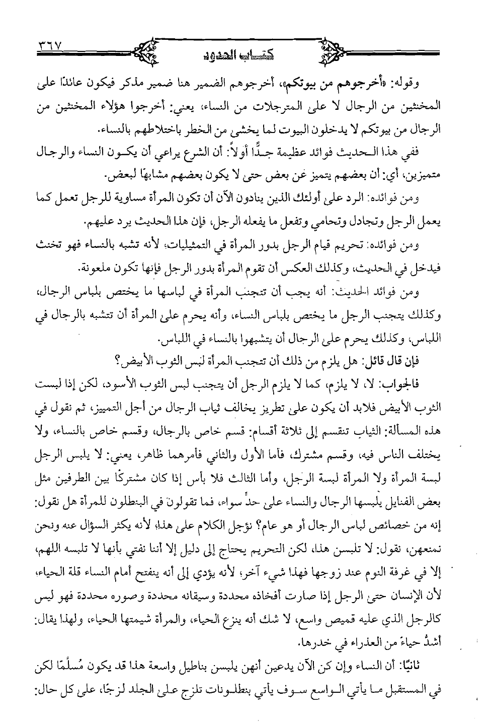 وقوله: "أخرجوهم من بيوتكم"، أخرجوهم الضمير هنا ضمير مذكر فيكون عائدًا على المخنثين من الرجال لا على المترجلات من النساء، يعني: أخرجوا هؤلاء المخنثين من الرجال من بيوتكم لا يدخلون البيوت لما يخشى من الخطر باختلاطهم بالنساء.