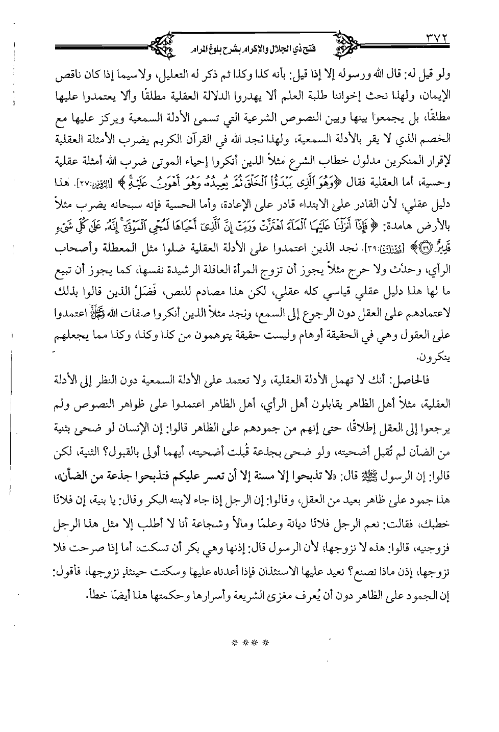 فالحاصل: أنك لا تهمل الأدلة العقلية، ولا تعتمد على الأدلة السمعية دون النظر إلى الأدلة العقلية، مثلًا أهل الظاهر يقابلون أهل الرأي، أهل الظاهر اعتمدوا على ظواهر النصوص ولم يرجعوا إلى العقل إطلاقًا، حتى إنهم من جمودهم على الظاهر قالوا: إن الإنسان لو ضحى بثنية من الضأن لم تقبل أضحيته، ولو ضحى بجذعة قبلت أضحيته، أيهما أولى بالقبول؟ الثنية، لكن قالوا: إن الرسول صلى الله عليه وسلم قال: "لا تذبحوا إلَّا مسنة إلَّا أن تعسر عليكم فتذبحوا جذعة من الضأن"، هذا جمود على ظاهر بعيد من العقل، وقالوا: إن الرجل إذا جاء لابنته البكر وقال: يا بنية، إن فلانًا خطبك، فقالت: نعم الرجل فلانًا ديانة وعلمًا ومالًا وشجاعة أنا لا أطلب إلَّا مثل هذا الرجل فزوجنيه، قالوا: هذه لا نزوجها؛ لأن الرسول قال: إذنها وهي بكر أن تسكت، أما إذا صرحت فلا نزوجها، إذن ماذا نصنع؟ نعيد عليها الاستئذان فإذا أعدناه عليها وسكتت حينئذٍ نزوجها، فأقول: إن الجمود على الظاهر دون أن يعرف مغزى الشريعة وأسرارها وحكمتها هذا أيضًا خطأ.