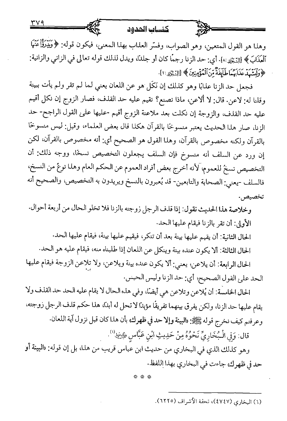 فجعل حد الزنا عذابًا وهو كذلك إن تكل هو عن اللعان يعني لما لم تقر ولم يأت ببيئة وقلنا له: لاعن. قال: لا ألاعن، ماذا نصنع؟ نقيم عليه حد القذف، فصار الزوج إن نكل أقيم عليه حد القذف، والزوجة إن نكلت بعد ملاعنة الزوج أقيم - عليها على القول الراجح - حد الزنا، صار هذا الحديث يعتبر منسوخًا بالقرآن هكذا قال بعض العلماء، وقيل: ليس منسوخًا بالقرآن ولكنه مخصوص بالقرآن، وهذا القول هو الصحيح أي: أنه مخصوص بالقرآن، لكن إن ورد عن السلف أنه منسوخ فإن السلف يجعلون التخصيص نسخًا، ووجه ذلك: أن التخصيص نسخٌ للعموم؛ لأنه أخرج بعض أفراد العموم عن الحكم العام وهذا نوعٌ من النسخ، فالسلف - يعني: الصحابة والتابعين - قد يعبرون بالنسخ ويريدون به التخصيص، والصحيح أنه تخصيص.