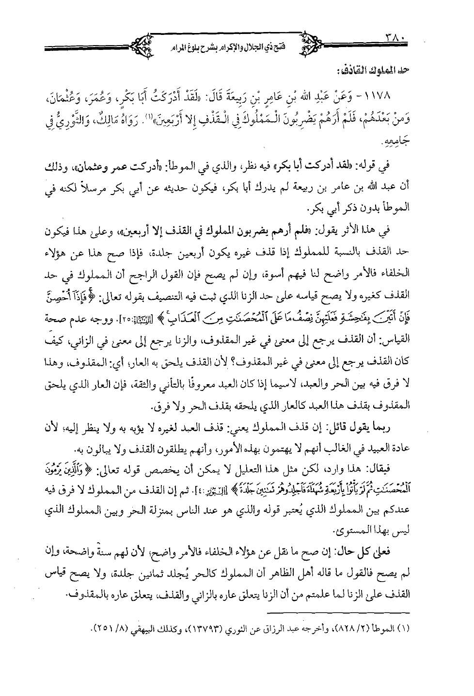 1178 - وعن عبد الله بن عامرٍ بن ربيعة قال: "لقد أدركت أبا بكرٍ، وعمر، وعثمان، ومن بعدهم، فلم أرهم يضربون المملوك في القذف إلَّا أربعين". رواه مالكٌ، والثَّوريُّ في جامعه.
