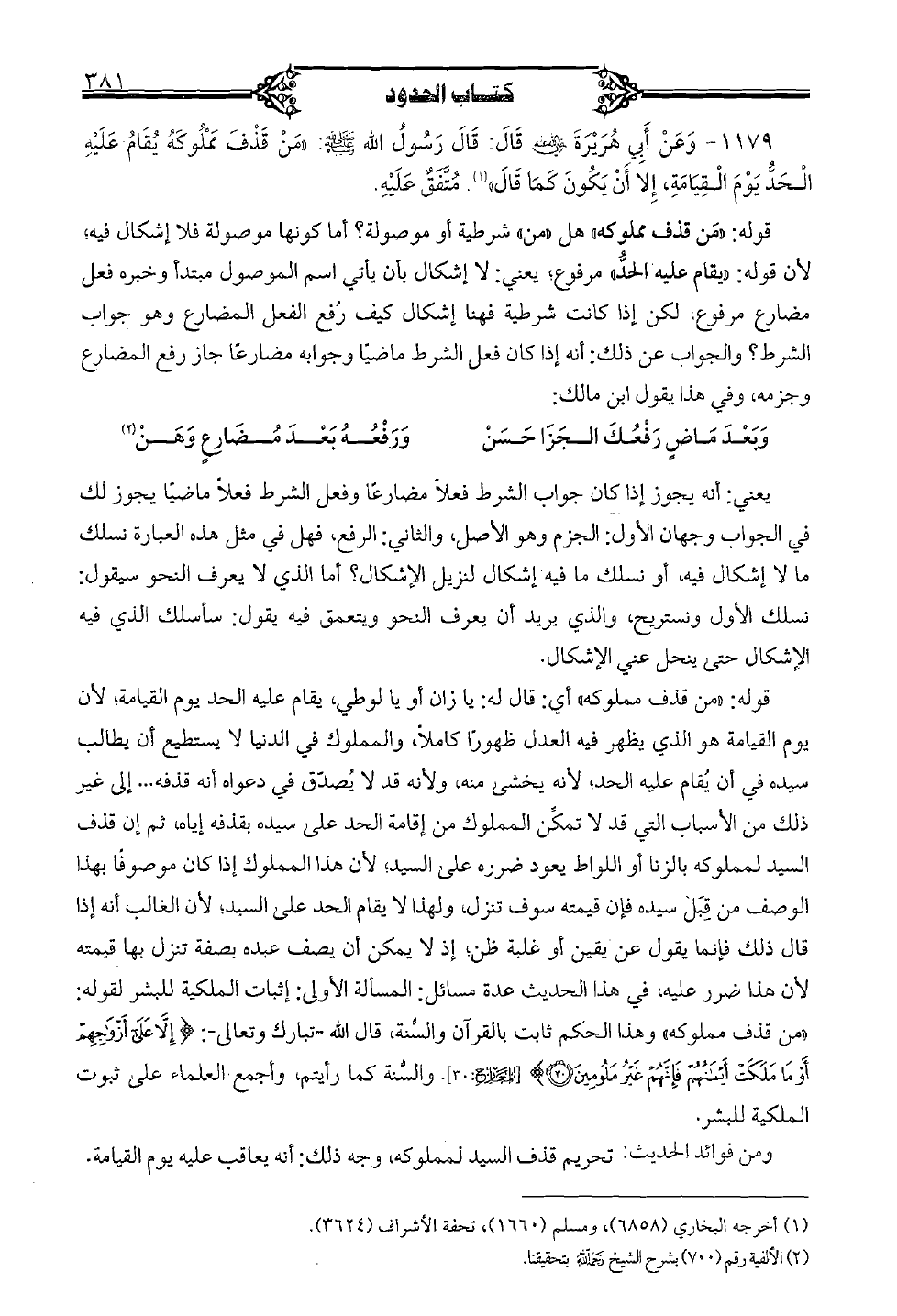 قوله: "من قذف مملوكه" هل "من" شرطية أو موصولة؟ أما كونها موصولة فلا إشكال فيه؛ لأن قوله: "يقام عليه الحدُّ" مرفوع؛ يعني: لا إشكال بأن يأتي اسم الموصول مبتدأ وخبره فعل مضارع مرفوع، لكن إذا كانت شرطية فهنا إشكال كيف رفع الفعل المضارع وهو جواب الشرط؟ والجواب عن ذلك: أنه إذا كان فعل الشرط ماضيًا وجوابه مضارعًا جاز رفع المضارع وجزمه، وفي هذا يقول ابن مالك: