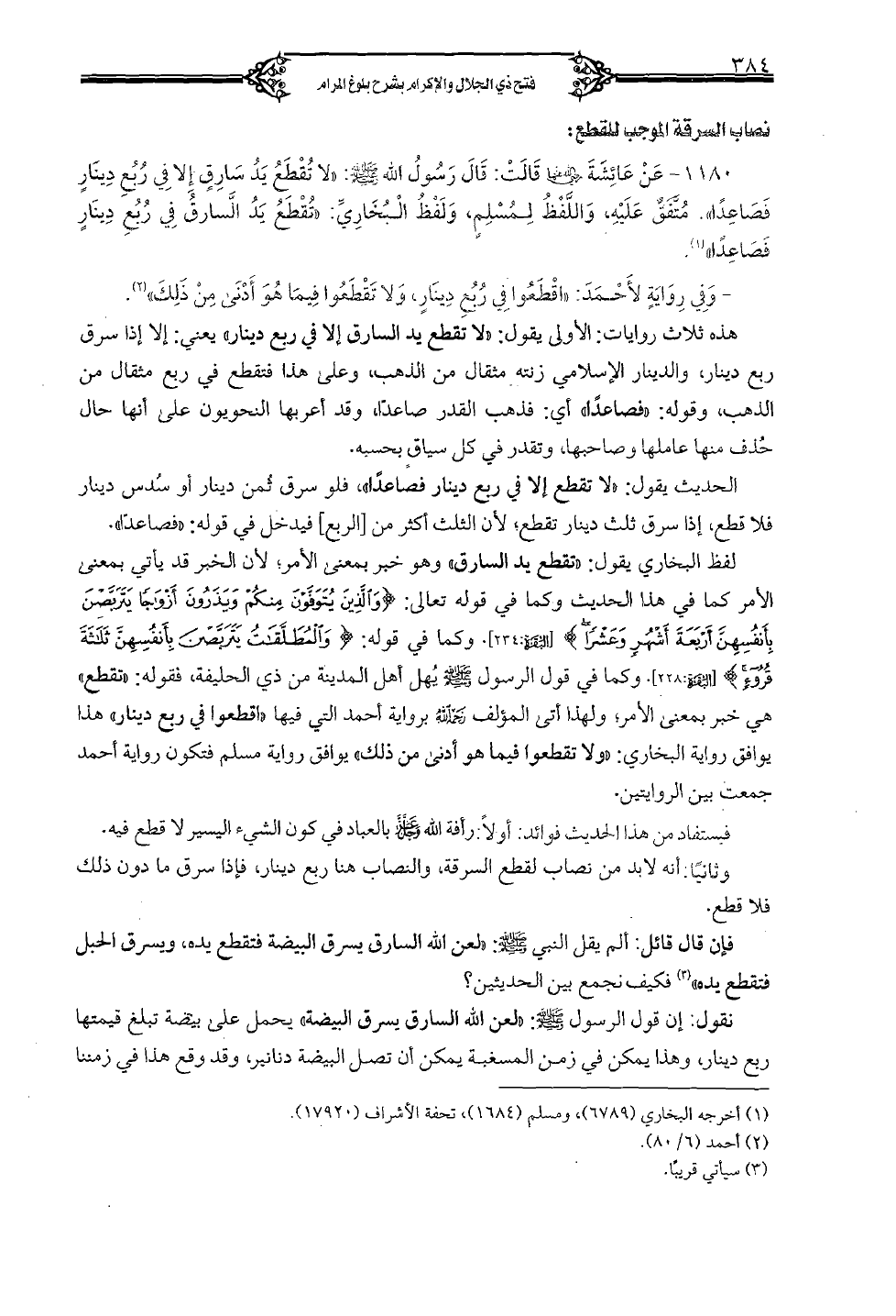 1180 - عن عائشة رضي الله عنها قالت: قال رسول الله صلى الله عليه وسلم: "لا تقطع يد سارقٍ إلا في ربع دينارٍ فصاعدًا". متَّفقٌ عليه، واللَّفظ لمسلمٍ، ولفظ البخاريِّ: "تقطع يد السارق في ربع دينارٍ فصاعدًا".