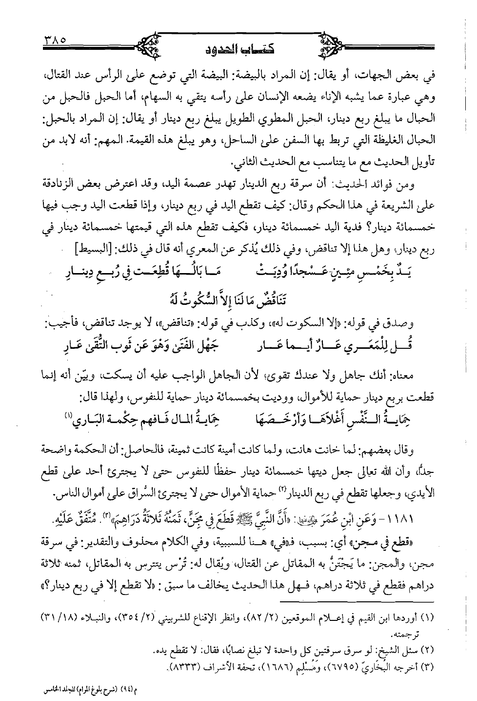 ومن فوائد الحديث: أن سرقة ربع الدينار تهدر عصمة اليد، وقد اعترض بعض الزنادقة على الشريعة في هذا الحكم وقال: كيف تقطع اليد في ربع دينار، وإذا قطعت اليد وجب فيها خمسمائة دينار؟ فدية اليد خمسمائة دينار، فكيف تقطع هذه التي قيمتها خمسمائة دينار في ريع دينار، وهل هلًا إلَّا تناقض، وفي ذلك يذكر عن المعري أنه قال في ذلك: [البسيط]