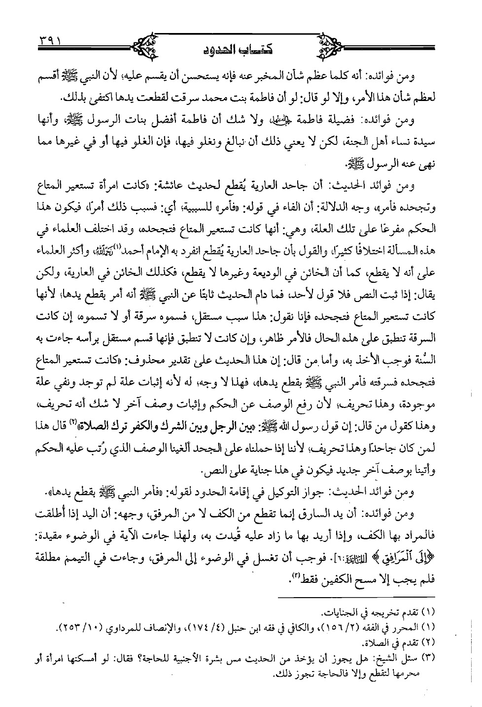 ومن فوائد الحديث: أن جاحد العارية يقطع لحديث عائشة: "كانت امرأة تستعير المتاع وتجحده فأمر"، وجه الدلالة: أن الفاء في قوله: "فأمر" للسببية؛ أي: فسبب ذلك أمرًا، فيكون هذا الحكم مفرعًا على تلك العلة، وهي: أنها كانت تستعير المتاع فتجحده، وقد اختلف العلماء في هذه المسألة اختلافًا كثيرًا، والقول بأن جاحد العارية يقطع انفرد به الإمام أحمد رحمه الله، وأكثر العلماء على أنه لا يقطع، كما أن الخائن في الوديعة وغيرها لا يقطع، فكذلك الخائن في العارية، ولكن يقال: إذا ثبت النص فلا قول لأحد، فما دام الحديث ثابتا عن النبي صلى الله عليه وسلم أنه أمر بقطع يدها؛ لأنها كانت تستعير المتاع فتجحده فإنا نقول: هذا سبب مستقل، فسموه سرقة أو لا تسموه، إن كانت السرقة تنطبق على هذه الحال فالأمر ظاهر، وإن كانت لا تنطبق فإنها قسم مستقل برأسه جاءت به السُّنة فوجب الأخذ به، وأما من قال: إن هذا الحديث على تقدير محذوف: "كانت تستعير المتاع فتجحده فسرقته فأمر النبي صلى الله عليه وسلم بقطع يدها"، فهذا لا وجه، له لأنه إثبات علة لم توجد ونفي علة موجودة، وهذا تحريف، لأن رفع الوصف عن الحكم وإثبات وصف آخر لا شك أنه تحريف، وهذا كقول من قال: إن قول رسول الله صلى الله عليه وسلم: "بين الرجل وبين الشرك والكفر ترك الصلاة" قال هذا لمن كان جاحدًا وهذا تحريف؛ لأننا إذا حملناه على الجحد ألغينا الوصف الذي رتب عليه الحكم وأتينا بوصف آخر جديد فيكون في هذا جناية على النص.