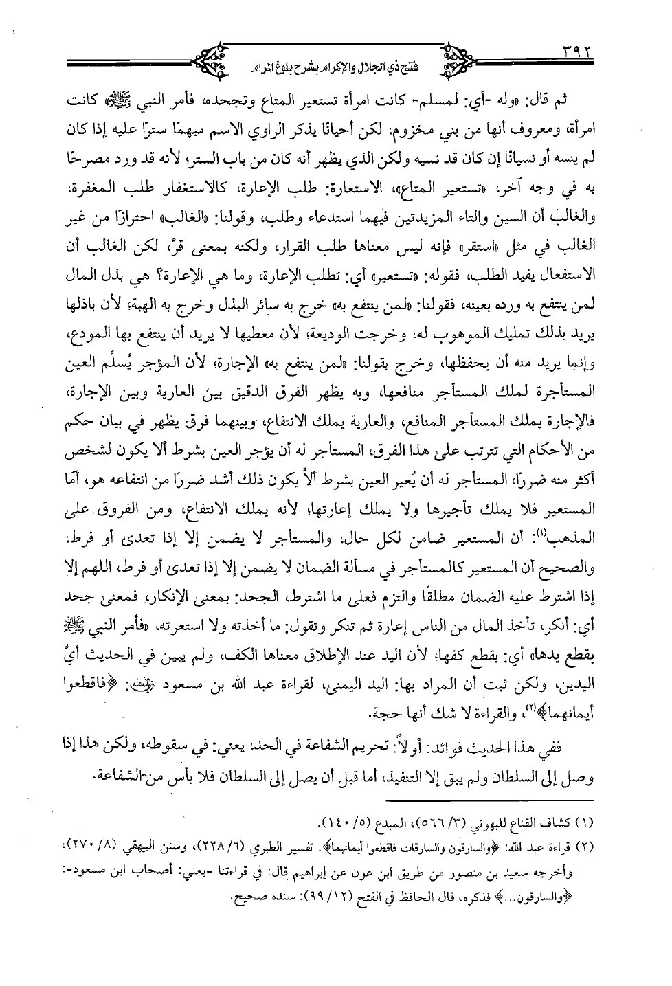 ثم قال: "وله - أي: لمسلم - كانت امرأة تستعير المتاع وتجحده، فأمر النبي صلى الله عليه وسلم" كانت امرأة، ومعروف أنها من بني مخزوم، لكن أحيانًا يذكر الراوي الاسم مبهمًا سترًا عليه إذا كان لم ينسه أو نسيانًا إن كان قد نسيه ولكن الذي يظهر أنه كان من باب الستر؛ لأنه قد ورد مصرحًا به في وتجه آخر، "تستعير المتاع"، الاستعارة: طلب الإعارة، كالاستغفار طلب المغفرة، والغالب أن السين والتاء المزيدتين فيهما استدعاء وطلب، وقولنا: "الغالب"، احترازًا من غير الغالب في مثل "استقر" فإنه ليس معناها طلب القرار، ولكنه بمعنى قرَّ، لكن الغالب أن الاستفعال يفيد الطلب، فقوله: "تستعير" أي: تطلب الإعارة، وما هي الإعارة؟ هي بذل المال لمن ينتفع به ورده بعينه، فقولنا: "لمن ينتفع به" خرج به سائر البذل وخرج به الهبة؛ لأن باذلها يريد بذلك تمليك الموهوب له، وخرجت الوديعة؛ لأن معطيها لا يريد أن ينتفع بها المودع، وإنما يريد منه أن يحفظها، وخرج بقولنا: "لمن ينتفع به" الإجارة؛ لأن المؤجر يسلِّم العين المستأجرة لملك المستأجر منافعها، وبه يظهر الفرق الدقيق بين العارية وبين الإجارة، فالإجارة يملك المستأجر المنافع، والعارية يملك الانتفاع، وبينهما فرق يظهر في بيان حكم من الأحكام التي تترتب على هذا الفرق، المستأجر له أن يؤجر العين بشرط إلَّا يكون لشخص أكثر منه ضررًا، المستأجر له أن يعير العين بشرط ألَّا يكون ذلك أشد ضررًا من انتفاعه هو، أمَّا المستعير فلا يملك تأجيرها ولا يملك إعارتها، لأنه يملك الانتفاع، ومن الفروق. على المذهب: أن المستعير ضامن لكل حال، والمستأجر لا يضمن إلَّا إذا تعدى أو فرط، والصحيح أن المستعير كالمستأجر في مسألة الضمان لا يضمن إلَّا إذا تعدى أو فرط، اللهم إلَّا إذا اشترط عليه الضمان مطلقًا والتزم فعلى ما اشترط، الجحد: بمعنى الإنكار، فمعنى جحد أي: أنكر، تأخذ المال من الناس إعارة ثم تنكر وتقول: ما أخذته ولا استعرته، "فأمر النبي صلى الله عليه وسلم بقطع يدها"، أي: بقطع كفها؛ لأن اليد عند الإطلاق معناها الكف، ولم يبين في الحديث أيُّ اليدين، ولكن ثبت أن المراد بها: اليد اليمنى، لقراءة عبد الله بن مسعود في رضي الله عنه: {فاقطعوا أيمانهما}، والقراءة لا شك أنها حجة.