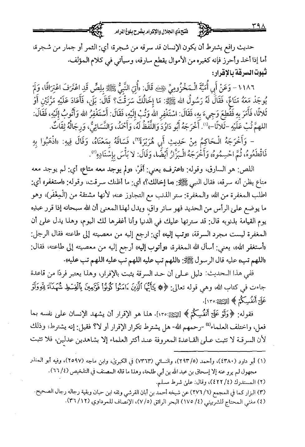 1186 - وعن أبي أميَّة رضي الله عنه قال: "أتي النَّبيُّ صلى الله عليه وسلم بلصٍ قد اعترف اعترافًا، ولم يوجد معه متاعٌ، فقال له رسول الله صلى الله عليه وسلم: ما إخالك سرقت؟ قال: بلى، فأعاد عليه مرَّتين أو ثلاثًا، فأمر به فقطع وجيء به، فقال: استغفر الله وتب إليه، فقال: أستغفر الله وأتوب إليه، فقال: اللهمَّ تب عليه - ثلاثًا-". أخرجه أبو داود واللَّفظ له، وأحمد، والنِّسائيُّ، ورجاله ثقاتٌ.