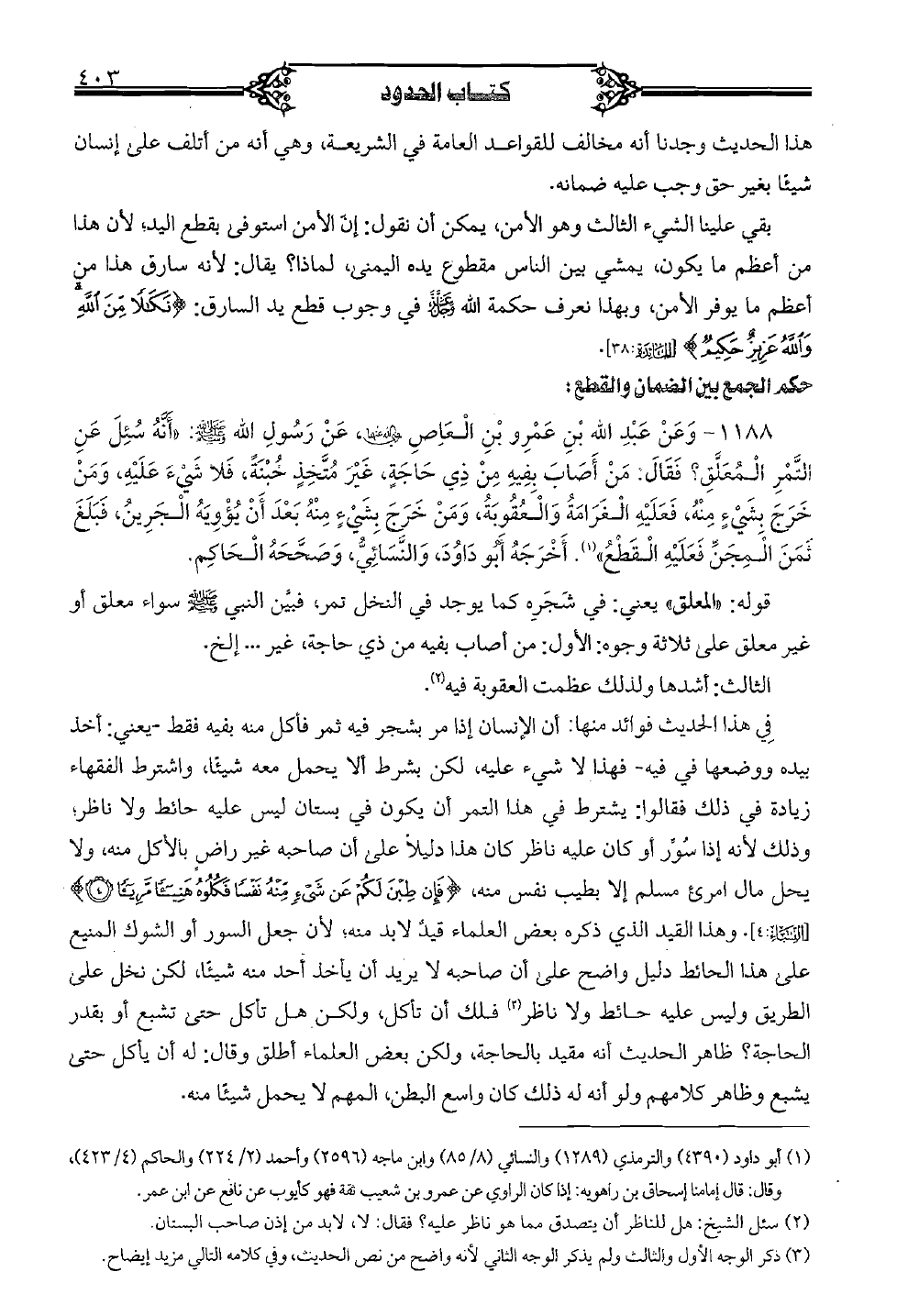 1188 - وعن عبد الله بن عمرو بن العاص في رضي الله عنه، عن رسول الله صلى الله عليه وسلم: " أنه سئل عن التَّمر المعلَّق؟ فقال: من أصاب بفيه من ذي حاجةٍ، غير متَّخذٍ خبنةٍ، فلا شيء عليه، ومن خرج بشيءٍ منه، فعليه الغرامة والعقوبة، ومن خرج بشيءٍ منه بعد أن يؤويه الجرين، فبلغ ثمن المجنِّ فعليه القطع". أخرجه أبو داود، والنَّسائيُّ، وصحَّحه الحاكم.