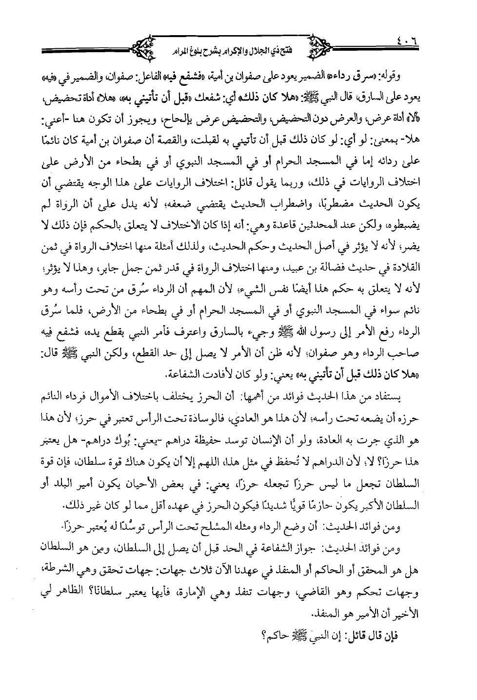 وقوله: "سرق رداءه" الضمير يعود على صفوان بن أمية، "فشفع فيه" الفاعل: صفوان، والضمير في "فيه" يعود على السارق، قال النبي صلى الله عليه وسلم: "هلًا كان ذلك" أي: شفعك "قبل أن تأتيني به"، "هلا" أداة تحضيض، "ألا" أداة عرض، والعرض دون التحضيض، والتحضيض عرض بإلحاح، ويجوز أن تكون هنا - أعني: هلا بمعنى: لو أي: لو كان ذلك قبل أن تأتي به لقبلت، والقصة أن صفوان بن أمية كان نائمًا على ردائه إما في المسجد الحرام أو في المسجد النبوي أو في بطحاء من الأرض على اختلاف الروايات في ذلك، وربما يقول قائل: اختلاف الروايات على هذا الوجه يقتضي أن يكون الحديث مضطربا، واضطراب الحديث يقتضي ضعفه؛ لأنه يدل على أن الرواة لم يضبطوه، ولكن عند المحدثين قاعدة وهي: أنه إذا كان الاختلاف لا يتعلق بالحكم فإن ذلك لا يضر، لأنه لا يؤثر في أصل الحديث وحكم الحديث، ولذلك أمثلة منها اختلاف الرواة في ثمن القلادة في حديث فضالة بن عبيد، ومنها اختلاف الرواة في قدر ثمن جمل جابر، وهذا لا يؤثر لأنه لا يتعلق به حكم هذا أيضًا نفس الشيء؛ لأن المهم أن الرداء سرق من تحت رأسه وهو نائم سواء في المسجد النبوي أو في المسجد الحرام أو في بطحاء من الأرض، فلما سرق الرداء رفع الأمر إلى رسول الله صلى الله عليه وسلم وجيء بالسارق واعترف فأمر النبي بقطع يده، فشفع فيه صاحب الرداء وهو صفوان، لأنه ظن أن الأمر لا يصل إلى حد القطع، ولكن النبي صلى الله عليه وسلم قال: "هلا كان ذلك قبلي أن تأتيني به" يعني: ولو كان لأفادت الشفاعة.