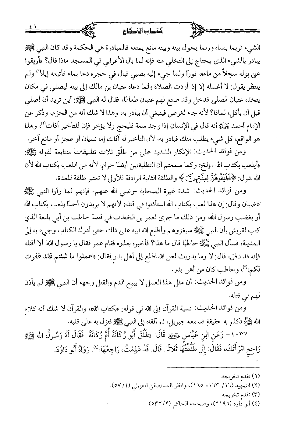 1032 - وعن ابن عباس رضي الله عنهم قال: "طلق أبو ركانة أم ركانة. فقال له رسول الله صلى الله عليه وسلم راجع امرأتك، فقال: إنا طلقَّتها ثلاثُا. قال: قد علمت، راجعها". رواه أبو داود.
