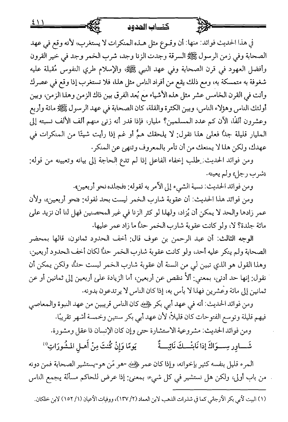 الوجه الثالث: أن عبد الرحمن بن عوف قال: أخف الحدود ثمانون، قالها بمحضر الصحابة ولم ينكر عليه أحد، ولو كانت عقوبة شارب الخمر حلًا لكان أخف الحدود أربعين، وهذا القول هو الذي تبين لي من السُّنة أن عقوبة شارب الخمر ليست حدًّا، ولكن يمكن أن نقول: إنها حد أدنى، بمعني: ألَّا ننقص عن أربعين، أما الزيادة على أربعين إلى ثمانين أو عن ثمانين إلى مائة وعشرين فهذا لا بأس به، إذا كان الناس لا يرتدعون بدونه.