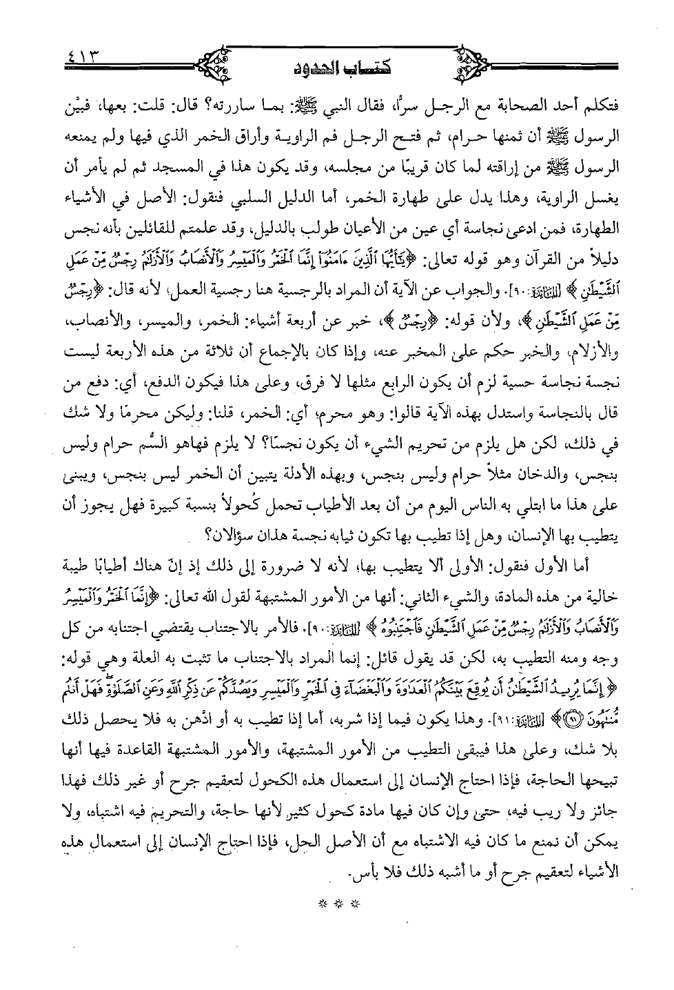 فتكلم أحد الصحابة مع الرجل سرًّا، فقال النبي صلى الله عليه وسلم: بما ساررته؟ قال: قلت: بعها، فبيَّن الرسول صلى الله عليه وسلم أن ثمنها حرام، ثم فتح الرجل فم الراوية وأراق الخمر الذي فيها ولم يمنعه الرسول صلى الله عليه وسلم من إراقته لما كان قريبًا من مجلسه، وقد يكون هذا في المسجد ثم لم يأمر أن يغسل الراوية، وهذا يدل على طهارة الخمر، أما الدليل السلبي فنقول: الأصل في الأشياء الطهارة، فمن ادعى نجاسة أي عين من الأعيان طولب بالدليل، وقد علمتم للقائلين بأنه نجس دليلًا من القرآن وهو قوله تعالى: {با أيُّها الَّذين ءامنوا إنَّما الخمر والميسر والأنصاب والأزلام رجسٌ من عمل الشيطان} [المائدة: 90]. والجواب عن الآية أن المراد بالرجسية هنا رجسية العمل؛ لأنه قال: {رجسٌ من عمل الشيطان}، ولأن قوله: {رجسٌ}، خبر عن أربعة أشياء: الخمر، والميسر، والأنصاب، والأزلام، والخبر حكم على المخبر عنه، وإذا كان بالإجماع أن ثلاثة من هذه الأربعة ليست نجسة نجاسة حسية لزم أن يكون الرابع مثلها لا فرق، وعلى هذا فيكون الدفع، أي: دفع من قال بالنجاسة واستدل بهذه الآية قالوا: وهو محرم؛ أي: الخمر، قلنا: وليكن محرمًا ولا شك في ذلك، لكن هل يلزم من تحريم الشيء أن يكون نجسًا؟ لا يلزم فها هو السُّم حرام وليس. بنجس، والدخان مثلًا حرام وليس بنجس، وبهذه الأدلة يتبين أن الخمر ليس بنجس، ويبنى على هذا ما أبتلي به الناس اليوم من أن بعد الأطياب تحمل كحولًا بنسبة كبيرة فهل يجوز أن يتطيب بها الإنسان، وهل إذا تطيب بها تكون ثيابه نجسة هذان سؤالان؟