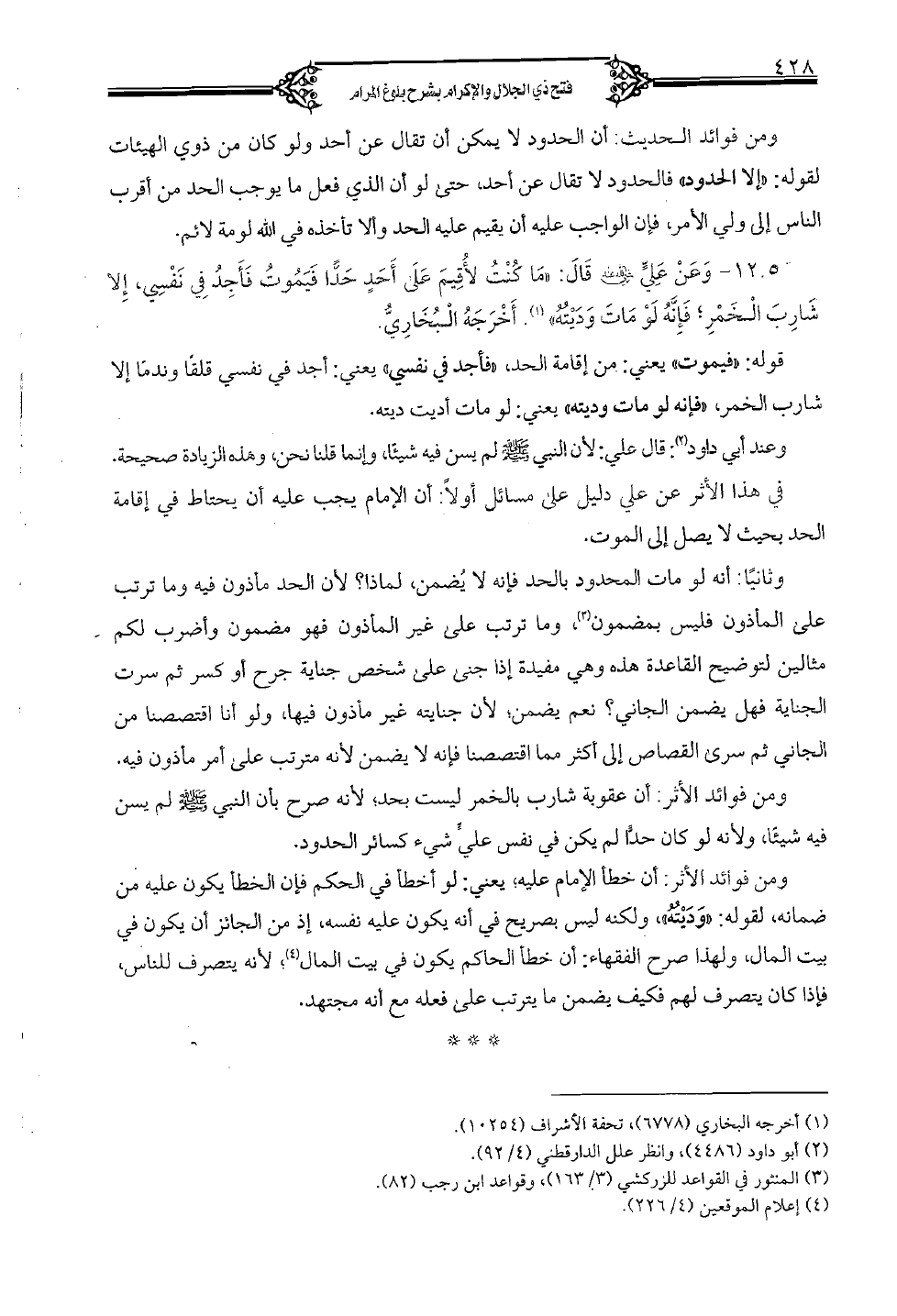 وثانيًا: أنه لو مات المحدود بالحد فإنه لا يضمن، لماذا؟ لأن الحد مأذون فيه وما ترتب على المأذون فليس بمضمون، وما ترتب على غير المأذون فهو مضمون وأضرب لكم مثالين لتوضيح القاعدة هذه وهي مفيدة إذا جنى على شخص جناية جرح أو كسر ثم سرت الجناية فهل يضمن الجاني؟ نعم يضمن؛ لأن جنايته غير مأذون فيها، ول أنا اقتصصنا من الاني ثم سرى القصاص إلى أكثر مما اقتصصنا فإنه لا يضمن لأنه مترتب على أمر مأذون فيه. ومن فوائد الأثر: أن عقوبة شارب الخمر ليست بحد؛ لأنه صرح بأن النبي صلى الله عليه وسلم لم يسن فيه شيئًا، ولأنه لو كان حدًّا لم يكن في نفس عليٍّ شيء كسائر الحدود.
