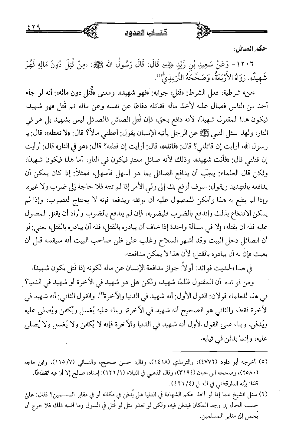 1206 - وعن سعيد بن زيد رضي الله عنه قال: قال رسول الله صلى الله عليه وسلم: من قتل دون ماله فهو شهيٌد" رواه الأربعة، وصحَّحه التَّرمذيُّ.
