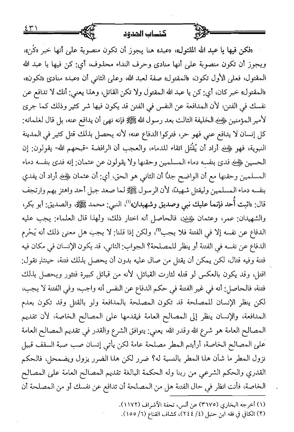 "فكن فيها يا عبد الله المقتول" "عبد" هنا يجوز أن تكون منصوبة على أنها خبر "كن"، ويجوز أن تكون منصوبة على أنها منادى وحرف النداء محذوف، أي: كن فيها يا عبد الله المقتول، فعلى الأول تكون، "المقتول" صفة لعبد الله، وعلى الثاني أن "عبد" منادى "تكون" "المقتول" خبر كان، أي: كن يا عبد الله المقتول ولا تكن القاتل، وهذا يعني: أنك لا تدافع عن نفسك في الفتن؛ لأن المدافعة عن النفس في الفتن قد يكون فيها شر كثير وذلك كما جرى لأمير المؤمنين رضي الله عنه الخليفة الثالث بعد رسول الله صلى الله عليه وسلم فإنه نهى أن يدافع عنه، بل قال لغلمانه كل إنسان لا يدافع عني فهو حر، فتركوا الدفاع عنه؛ لأنه يحصل بذلك قتل كثير في المدينة النبوية، فهو رضي الله عنه فدى بنفسه دماء المسلمين وحقنها ولا يقولون عن عثمان: إنه فدى بنفسه دماء المسلمين وحقنها مع أن الواضح جدًا أن الثاني هو الحق، أي: أن عثمان رضي الله عنه أراد أن يفدي بنفسه دماء المسلمين وليقتل شهيدًا؛ لأن الرسول صلى الله عليه وسلم لما صعد جبل أحد واهتز بهم وارتجف قال: "اثبت أحد فإنما عليك نبي وصديق وشهيدان"، النبي: محمد صلى الله عليه وسلم والصديق: أبو بكر، والشهيدان: عمر، وعثمان رضي الله عنهما، فالحاصل أنه اختار ذلك، ولهذا قال العلماء: يجب عليه الدفاع عن نفسه إلا في الفتنة فلا يجب، ولكن إذا قلنا: لا يجب هلى معنى ذلك أنه يحرم الدفاع عن نفسه في الفتانة أو ينظر للمصلحة؟ الجواب: الثاني، قد يكون الإنسان في مكان فيه فتنة وفيه قتال، لكن يمكن أن يقتل من صال عليه بدون أن يحصل بذلك فتنة، حينئذ نقول اقتل، وقد يكون بالعكس لو قتله لثارت القبائل؛ لأنه من قبائل كبيرة فتثور ويحصل بذلك فتنة، فالحاصل: أنه في غير الفتنة في حكم الدفاع عن النفس أنه واجب، وفي الفتنة لا يجب لكن ينظر الإنسان للمصلحة قد تكون المصلحة بالمدافعة ولو بالقتل وقد تكون بعدم المدافعة، والإنسان ينظر إلى المصالح العامة فيقدمها على المصالح الخاصة؛ لأن تقديم المصالح العامة هو شرع الله، يعني: يتوافق الشرع والقدر في تقديم المصالح العامة، على المصالح الخاصة، أرأيتم المطر مصلحة عامة لكن يأتي إنسان صب صبة السقف قبيل نزول المطر ما شأن هذا المطر بالنسبة له؟ ضرر له لكن هذا الضرر يزول ويضمحل، فالحكم القدري والحكم الشرعي من ربنا وله الحكمة البالغة تقديم المصالح العامة على المصالح الخاصة، فأنت انظر في حال الفتنة هل من المصالحة أن تدافع عن نفسك أو من المصلحة أن