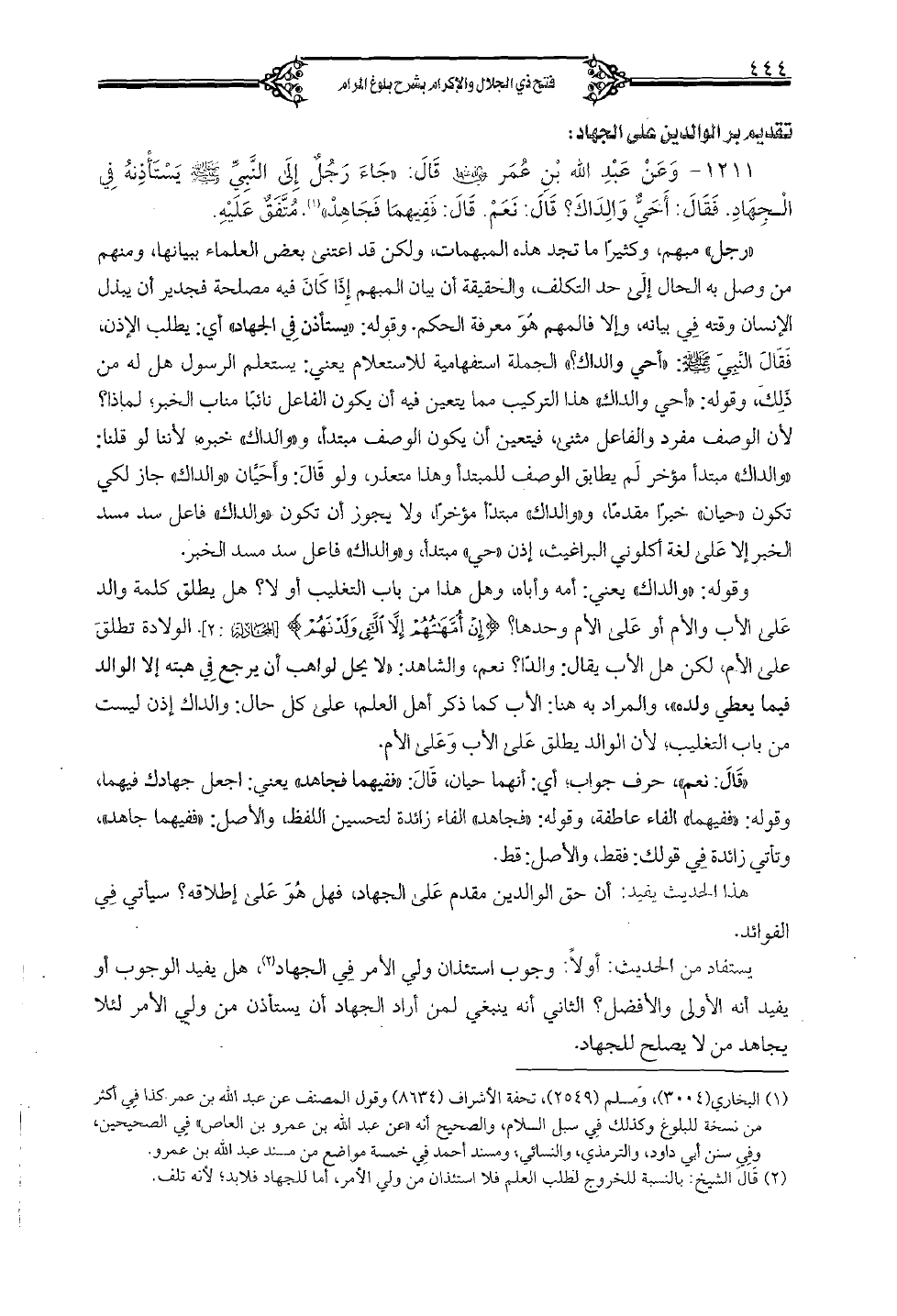 1211 - وعن عبد الله بن عُمر رضي الله قال: (جاء رجل إلى النَّبيِّ صلى الله عليه وسلم يستأذنه في الجهاد. فقال: أحيّ والداك؟ قال: نعم. قال: ففيهما فجاهد) مُتَّفق عليه.