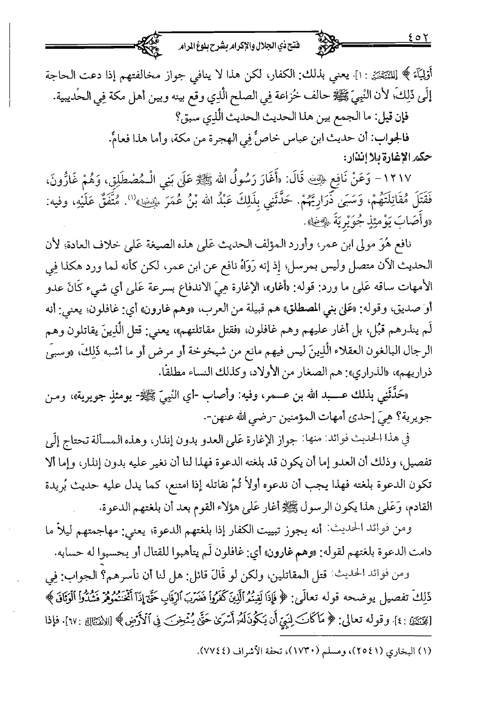 1217 - وعن نافع رضي الله عنه قال: "أغار رسول الله صلى الله عليه وسلم على بني المصطلق، وهم غارون، فقتل مقاتلتهم، وسبى ذراريهم. حدثني بذلك عبد الله بن عمر رضي الله عنه". متفق عليه، وفيه "وأصاب يومئذ جويرية رضي الله عنها".
