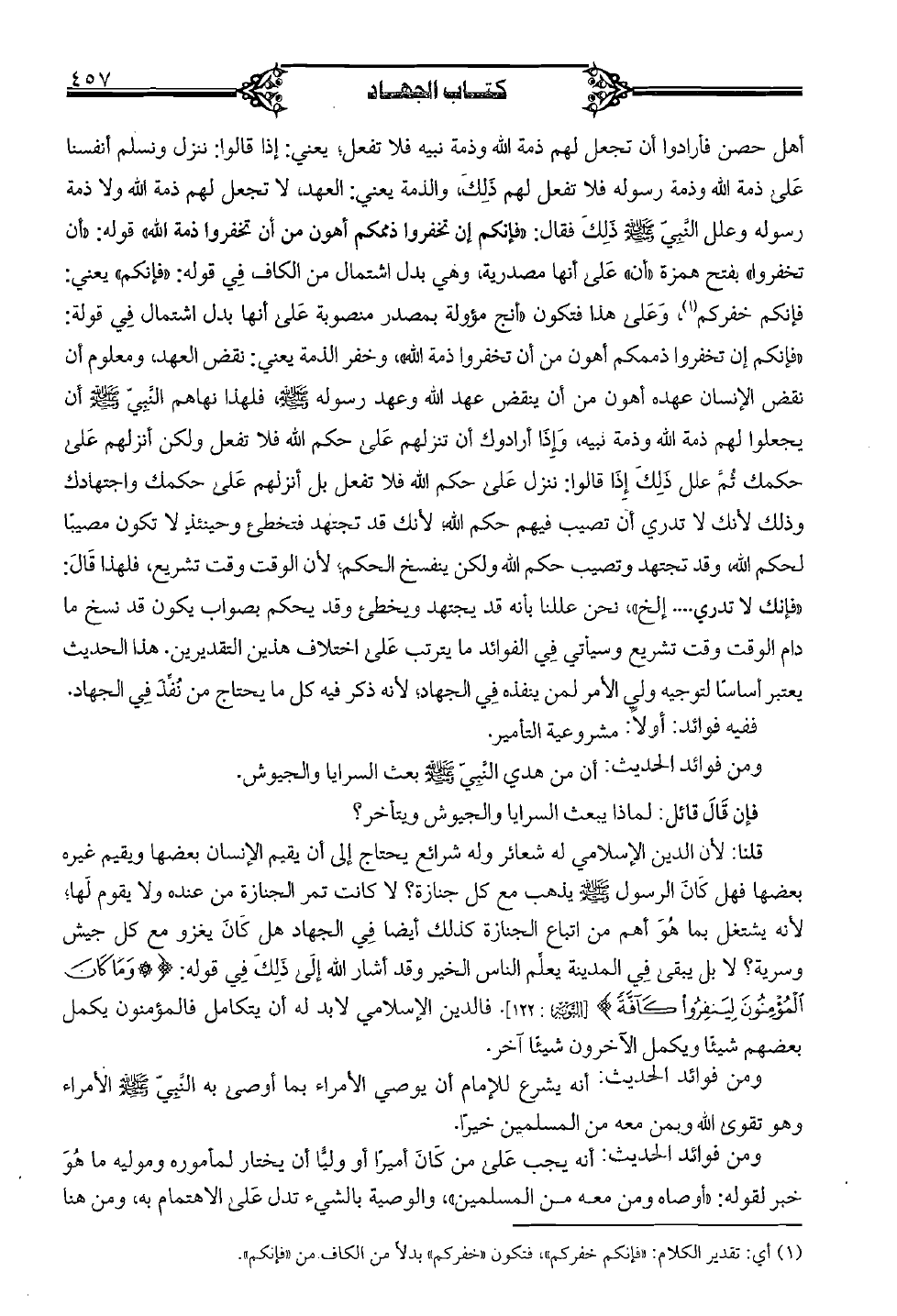 أهل حصن فأرادوا أن تجعل لهم ذمة الله وذمة نبيه فلا تفعل، يعني: إذا قالوا: ننزل ونسلم أنفسنا على ذمة الله وذمة رسوله فلا تفعل لهم ذلك، والذمة يعني: العهد، لا تجعل لهم ذمة الله ولا ذمة رسوله وعلل النبي صلي الله عليه وسلم ذلك فقال: "فإنكم إن تخفروا ذممكم أهون من أن تخفروا ذمة الله" قوله: "أن تخفروا" بفتح الهمزة "أن" على أنها مصدرية، وهي بدل اشتمال من الكاف في قوله: "فإنكم" يعني: فإنكم خفركم، وعلى هذا فتكون "أنج مؤولة بمصدر منصوبة على أنها بدل اشتمال في قوله: "فإنكم إن تخفروا ذممكم أهون من أن تخفروا ذمة الله" وخفر الذمة يعني: نقض العهد، ومعلوم أن نقض الإنسان عهده أهون من أن ينقض عهد الله وعهد رسوله صلي الله عليه وسلم فلهذا نهاهم النبي صلي الله عليه وسلم أن يجعلوا لهم ذمة الله وذمة نبيه، وإذا أرادوك أن تنزلهم على حكم الله فلا تفعل ولكن أنزلهم على حكمك ثم علل ذلك إذا قالوا: ننزل على حكم الله فلا تفعل بل أنزلهم على حكمك واجتهادك وذلك لأنك تدري أن تصيب فيهم حكم الله، لأنك قد تجتهد فتخطيء وحينئذ لا تكون مصيبًا لحكم الله، وقد تجتهد وتصيب حكم الله ولكن ينفسخ الحكم، لأن الوقت وقت تشريع، فلهذا قال: "فإنك لا تدري ... إلخ" نحن عللنا بأنه قد يجتهد ويخطئ وقد يحكم بصواب يكون قد نسخ ما دام الوقت وقت تشريع وسيأتي في الفوائد ما يترتب على اختلاف هذين التقديرين. هذا الحديث يعتبر أساسًا لتوجه ولي الأمر لمن ينفذه في الجهاد، لأنه ذكر فيه كل ما يحتاج من نفذ في الجهاد