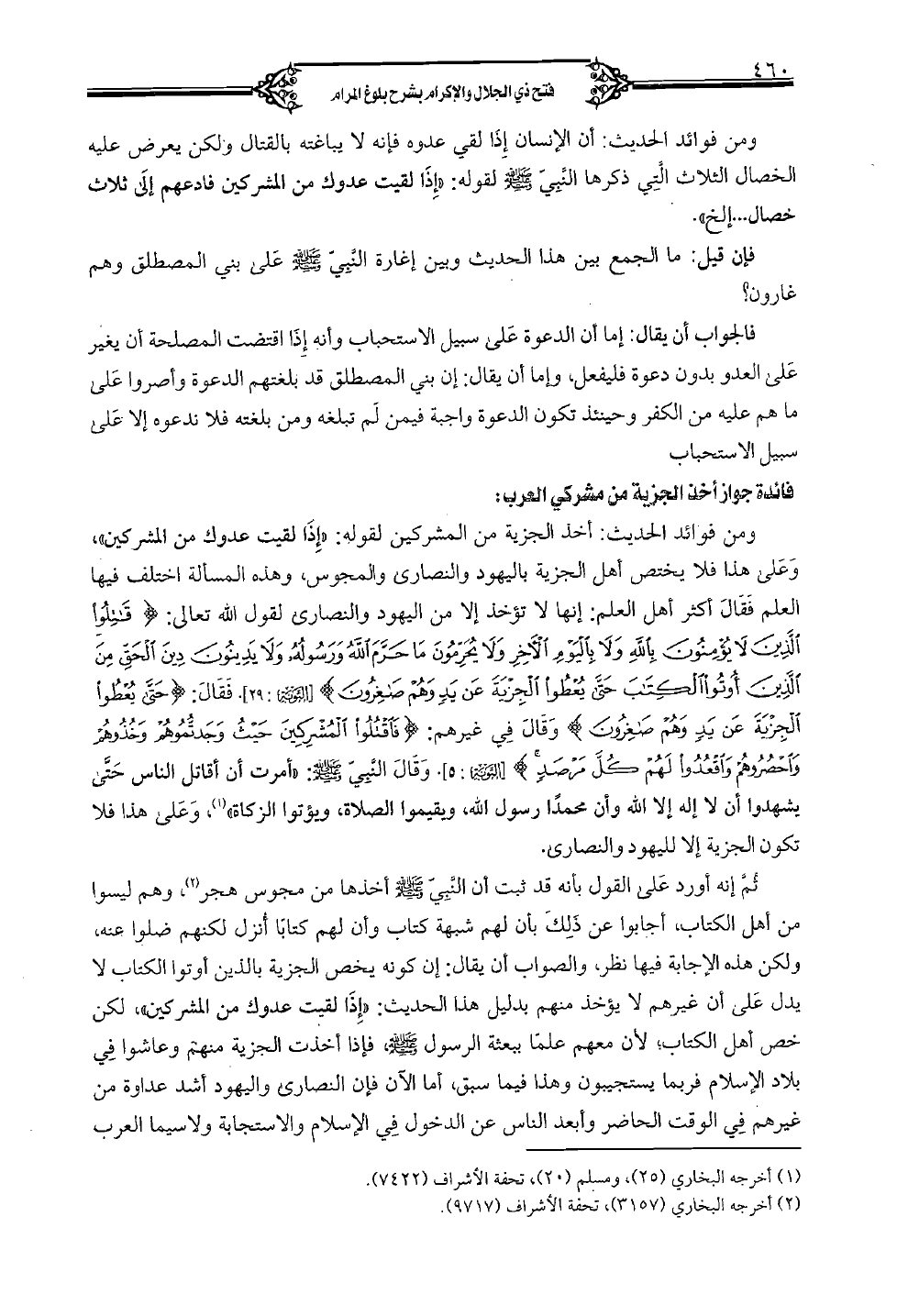 ثم إنه أورد على القول بأنه قد ثبت أن النبي صلي الله عليه وسلم أخذها من مجوس هجر، وهم ليسوا من أهل الكتاب، أجابوا على ذلك بأن لهم شبهة كتاب وأن لهم كتابًا أنزل لكنهم ضلوا عنه، ولكن هذه الإجابة فيها نظر، والصواب أن يقال: إن كونه يخص الجزية بالذين أوتوا الكتاب لا يدل على أن غيرهم لا يؤخذ منهم بدليل هذا الحديث: "إذا لقيت عدوك من المشركين"، لكن خص أهل الكتاب، لأن معهم علمًا ببعثة الرسول صلي الله عليه وسلم، فإذا أخذت الجزية منهم وعاشوا في بلاد الإسلام فربما يستجيبون وهذا فيما سبق، أما الآن فإن النصارى واليهود أشد عداوة من غيرهم في الوقت الحاضر وأبعد الناس عن الدخول في الإسلام والاستجابة ولاسيما العرب