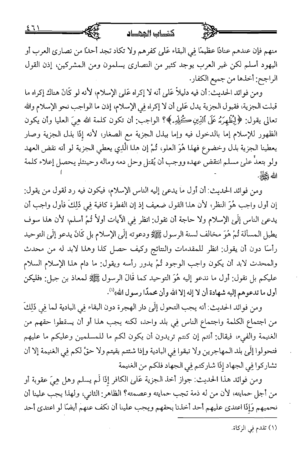ومن فوائد الحديث: أن فيه دليلًا على أنه لا إكراه على الإسلام، لأنه لو كان إكراه ما قبلت الجزية، فبقبول الجزية يدل على أن لا إكراه في الإسلام، إذن ما الواجب نحو الإسلام والله تعالى يقول: ? ليظهره على الدين كله? ؟ الواجب: أن تكون كلمة الله هي العليا وأن يكون الظهور للإسلام إما بالدخول فيه وإما ببذل الجزية مع الصغار، لأنه إذا بذل الجزية وصار يعطينا الجزية بذل وخضوع فهذا هو العلو، ثم إن هذا الذي يعطي الجزية لو أنه نقض العهد ولو بتعد على مسلم انتقض عهده ووجب أن يقتل وحل دمه وماله حينئذٍ يحصل إعلاء كلمة الله عز وجل.