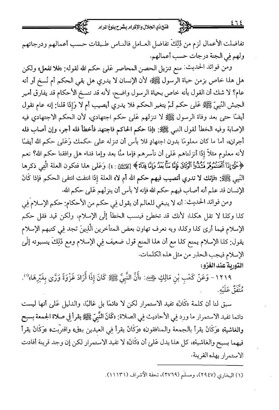 ومن فوائد الحديث: منع تنزيل الحصن المحاصر على حكم الله لقوله: "فلا تفعل" ولكن هل هذا خاض زمن حياة الرسول (صلى الله عليه وسلم)، لأن الإنسان لا يدري هل بقي الحكم أم نسخ أو أنه عام؟ لا شك أن القول بأنه خاص بحياة الرسول واضح، لأنه قد نسخ الأحكام قد يفارق أمير الجيش النبي (صلى الله عليه وسلم) على حكم ثم يتغير الحكم فلا يدري أيصيب أم لا وإذا قلنا: إنه عام نقول أيضًا حتى بعد وفاة الرسول (صلى الله عليه وسلم) لا تنزلهم على حكم اجتهادي، لأن الحكم الاجتهادي فيه الإصابة وفيه الخطأ لقول النبي (صلى الله عليه وسلم): "إذا حكم الحاكم فاجتهد فأخطأ فله أجر، وإن أصاب فله أجران"، أما ما كان معلومًا بدون اجتهاد فلا بأس أن تنزله على حكمك وعلى حكم الله أيضًا لأنه معلوم مثلاً إذا أنزلناهم على أن نأسرهم فإما منا بعد وإما فداء هل وافقنا حكم الله؟ نعم (حق إذا أتخنتموهم فشدوا الوثاق فإما منا بعد وإما فداء} [محمد: 4]، وعلى هذا فتكون العلة التي ذكرها النبي (صلى الله عليه وسلم): "فإنك لا تدري أتصيب فيهم حكم الله أم لا" العلة إذا انتفت انتفى الحكم فإذا كان الإنسان قد علم أنه أصاب فيهم حكم الله فإنه لا بأس أن ينزلهم على حكم الله.