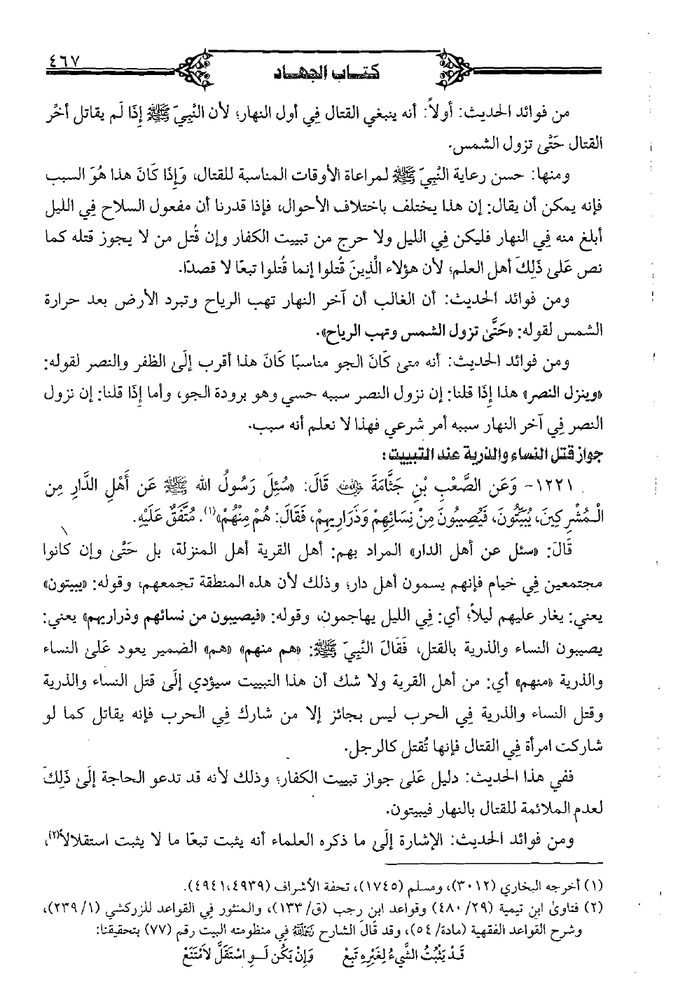 قال: "سئل عن أهل الدار" المراد بهم: أهل القرية أهل المنزلة، بل حتى وإن كانوا مجتمعين في خيام فإنهم يسمون أهل دار، وذلك لأن هذه المنطقة تجمعهم، وقوله: "يبيتون" يعني: يغار عليهم ليلاً، أي: في الليل يهاجمون، وقوله: "فيصيبون من نسائهم وذراريهم" يعني: يصيبون النساء والذرية بالقتل، فقال النبي (صلى الله عليه وسلم): "هم منهم" "هم" الضمير يعود إلى النساء والذرية "منهم" أي: من أهل القرية ولا شك أن هذا التبييت سيؤدي إلى قتل النساء والذرية وقتل النساء والذرية في الحرب ليس بجائز غلا من شارك في الحرب فإن يقاتل كما لو شاركت امرأة في القتال فإنها تقتل كالرجل.