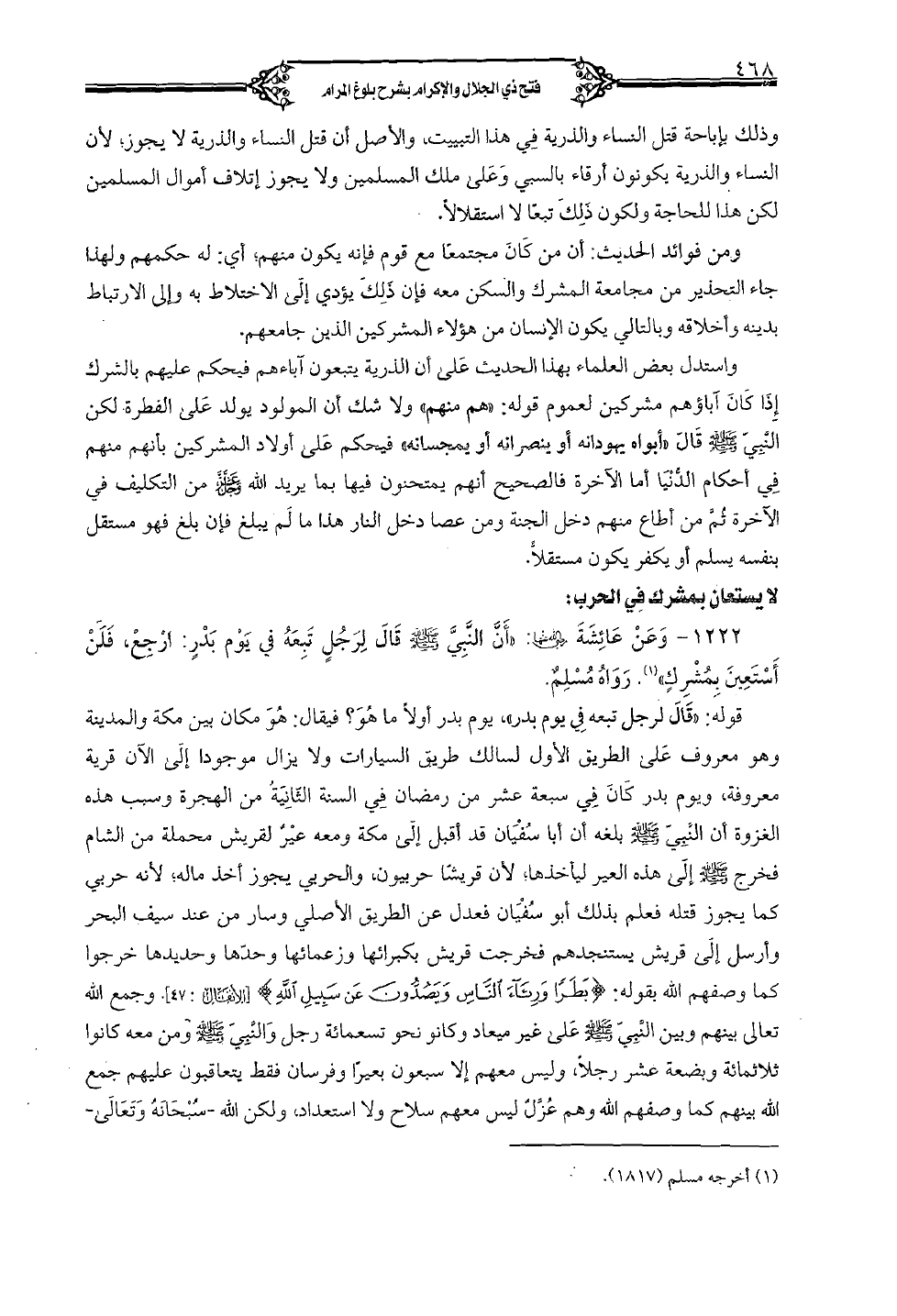 1222 - وعن عائشة رضي الله عنها: "أن النبي (صلى الله عليه وسلم) قال لرجل تبعه في يوم بدر: أرجع، فلن استعين بمشرك"، رواه مسلم.