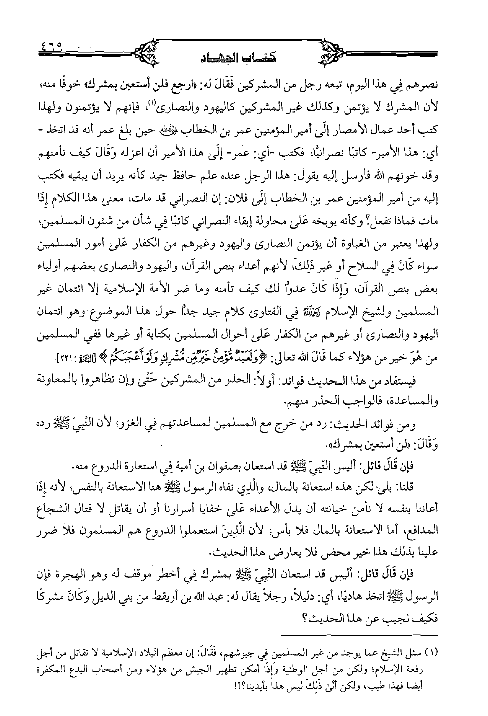 نصرهم في هذا اليوم، تبعه رجل من المشركين فقال: "ارجع فلن استعين بمشرك" خوفًا منه، لأن المشرك لا يؤتمن وكذلك غير المشركين كاليهود والنصارى، فإنهم لا يؤتمنون ولهذا كتب أحد عمال الأمصار إلى أمير المؤمنين عمر بن الخطاب (رضي الله عنه) حين بلغ عمر أنه قد اتخذ- أي: هذا الأمير- كاتبًا نصرانيًا، فكتب- أي: عمر- إلى هذا الأمير أن أعزله وقال كيف نأمنهم وقد خونهم الله فأرسل إليه يقول: هذا الرجل عنده علم حافظ جيد كأنه يريد أن يبقيه فكتب إليه من أمير المؤمنين عمر بن الخطاب إلى فلان: إن النصراني قد مات، معني هذا الكلام إذا مات فماذا تفعل؟ وكأنه يوبخه على محاولة إبقاء النصراني كاتبًا في شأن من شئون المسلمين، ولهذا يعتبر من الغباوة أن يؤتمن النصارى واليهود وغيرهم من الكفار على أمور المسلمين سواء كان في السلاح أو غير ذلك، لأنهم أعداء بنص القرآن، واليهود والنصارى بعضهم أولياء بعض بنص القرآن، وإذا كان عدوًا لك كيف تأمنه وما ضر الأمة الإسلامية إلا ائتمان غير المسلمين ولشيخ الإسلام (رحمه الله) في الفتاوى كلام جيد جدًا حول هذا الموضوع وهو ائتمان اليهود والنصارى أو غيرهم من الكفار على أحوال المسلمين بكتابة أو غيرها ففي المسلمين من هو خير من هؤلاء كما قال الله تعالى: {ولعبد مؤمن خير من مشرك ولو أعجبكم} [البقرة: 221].