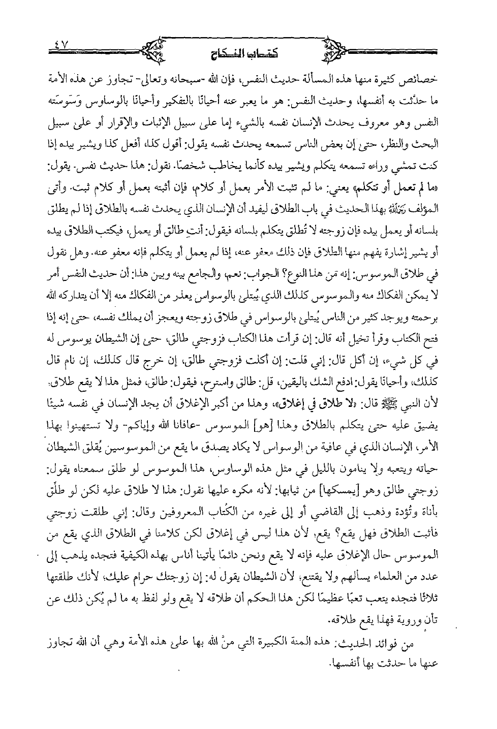 خصائص كثيرة منها هذه المسألة حديث النفس، فإن الله- سبحانه وتعالى- تجاوز عن هذه الأمة ما حدثت به أنفسها، وحديث النفس: هو ما يعبر عنه أحيانًا بالتفكير وأحيانًا بالوساوس وسوسته النفس وهو معروف يحدث الإنسان نفسه بالشيء إما على سبيل الإثبات والإقرار أو على سبيل البحث والنظر، حتى إن بعض الناس تسمعه يحدث نفسه يقول: أقول كذا، أفعل كذا ويشير بيده إذا كنت تمشي وراءه تسمعه يتكلم ويشير بيده كأنما يخاطب شخصًا. نقول: هذا حديث نفس. يقول: "ما لم تعمل أو تتكلم" يعني: ما لم تثبت الأمر ليفيد أن الإنسان الذي يحدث نفسه بالطلاق إذا لم يطلق بلسانه أو يعمل بيده فإن زوجته لا تطلق يتكلم بلسانه فيقول: أنت طالق أو يعمل، فيكتب الطلاق بيده أو يشير إشارة يفهم منها الطلاق فإن ذلك معفو عنه، إذا لم يعمل أو يتكلم فإنه معفو عنه. وهل نقول في طلاق الموسوس: إنه من هذا النوع؟ الجواب: نعم، والجامع بينه وبين هذا: أن حديث النفس أمر لا يمكن الفكاك منه والموسوس كذلك الذي يبتلى بالوسواس يعذر من الفكاك منه إلا أن يتداركه الله برحمته ويوجد كثير من الناس يبتلى بالوسواس في طلاق زوجته ويعجز أن يملك نفسه، حتى إنه إذا فتح الكتاب وقرأ تخيل أنه قال: إن قرأت هذا الكتاب فزوجتي طالق، حتى إن الشيطان يوسوس له في كل شيء، إن أكل قال: إني قلت: إن أكلت فزوجتي طالق، إن خرج قال كذلك، إن نام قال كذلك، وأحيانًا يقول: ادفع الشك باليقين، قل: طالق واسترح، فيقول: طالق، فمثل هذا لا يقع طلاق، لأن النبي صلى الله عليه وسلم قال: "لا طلاق في إغلاق"، وهذا من أكب الإغلاق أن يجد الإنسان في نفسه شيئًا يضيق عليه حتى يتكلم بالطلاق وهذا [هو] الموسوس- عافانا الله وإياكم- ولا تستهينوا بهذا الأمر، الإنسان الذي في عافية من الوسواس لا يكاد يصدق ما يقع من الموسوسين يقلق الشيطان حياته ويتعبه ولا ينامون بالليل في مثل هذه الوساوس، هذا الموسوس لو طلق سمعناه يقول: زوجتي طالق وهو [يمسكها] من ثيابها: لأنه مكره عليها نقول: هذا لا طلاق عليه لكن لو طلق بأناة وتؤدة وذهب إلى القاضي أو إلى غيره من الكتاب المعروفين وقال: إني طلقت زوجتي فأثبت الطلاق فهل يقع؟ يقع، لأن هذا ليس في إغلاق لكن كلامنا في الطلاق الذي يقع من الموسوس حال الإغلاق عليه فإنه لا يقع ونحن دائما يأتينا أناس بهذه الكيفية فتجده يذهب إلى عدد من العلماء سألهم ولا يقتنع؛ لأن الشيطان يقول له: إن زوجتك حرام عليك؛ لأنك طلقتها ثلاثًا فتجده يتعب تعبًا عظيمًا لكن هذا الحكم أن طلاقه لا يقع ولو لفظ به ما لم يكن ذلك عن تأن وروية فهذا يقع طلاقه.
