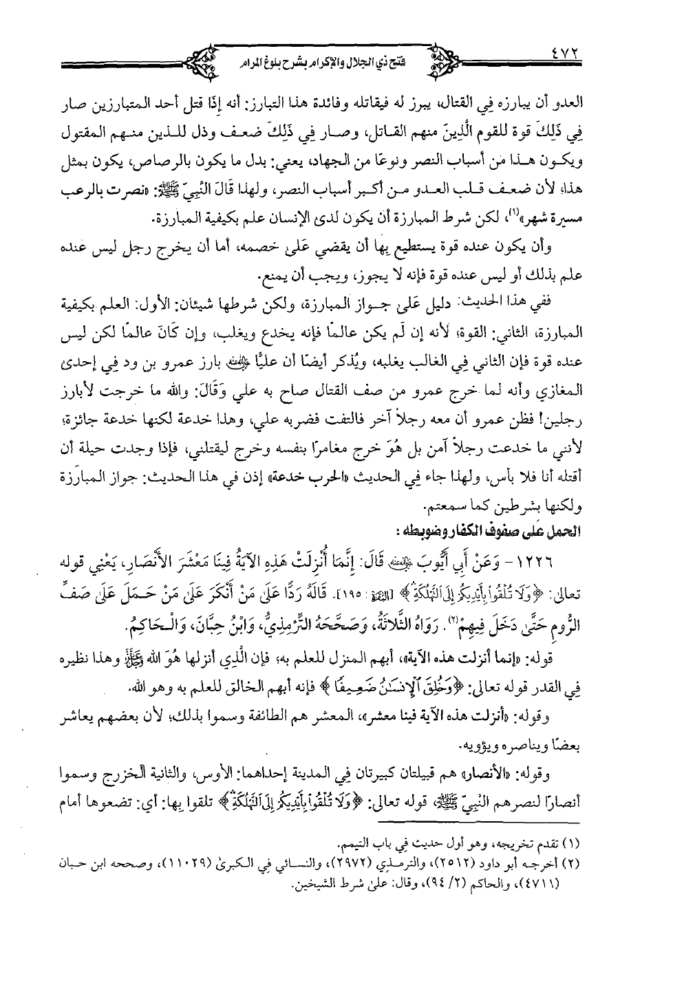 1226 - وعن أبى أيوب (رضي الله عنه) قال: إنما أنزلت هذه الآية فينا معشر الأنصار، يعني قوله تعالى: {ولا تلقوا بأيديكم إلى التهلكة} [البقرة: 195]، قاله ردًا على من أنرك على من حمل على صف الروم حتى دخل فيهم، رواه الثلاثة، وصححه الترمذي، وابن حبان، والحاكم.