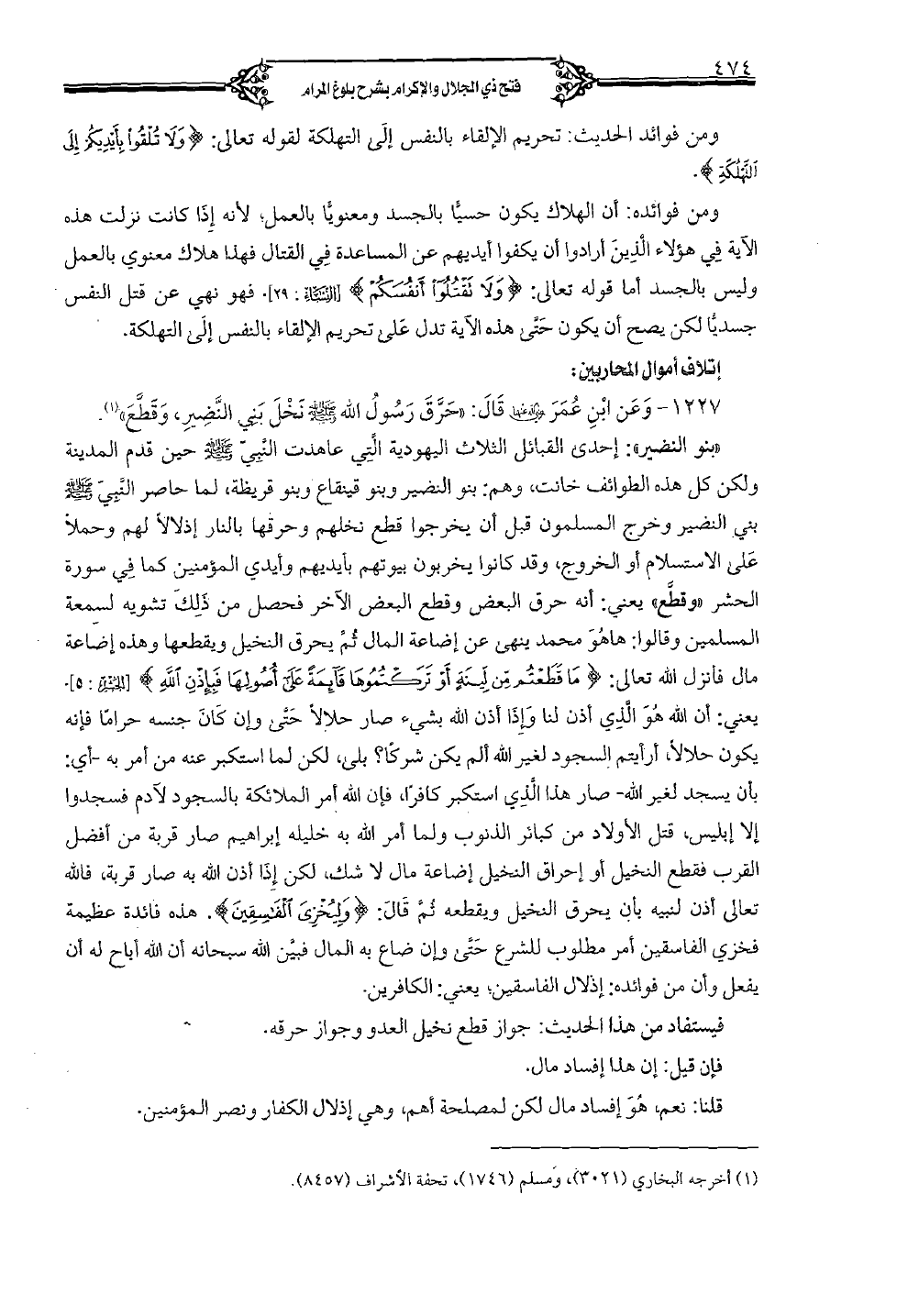 1227 - وعن ابن عمر (رضي الله عنها) قال: "حرق رسول الله (صلى الله عليه وسلم) نخل بني النضير، وقطع".