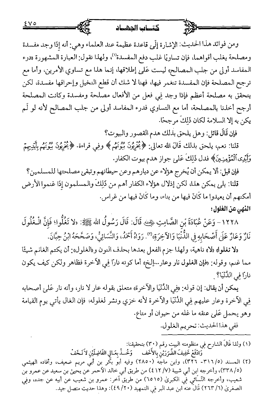 1228 - وعن عبادة بن الصامت (رضي الله عنه) قال: قال رسول الله (صلى الله عليه وسلم): "لا تغلوا؛ فإن الغلول نار وعار على أصحابه في الدنيا والآخرة"، رواه أحمد، والنسائي، وصححه ابن حبان.