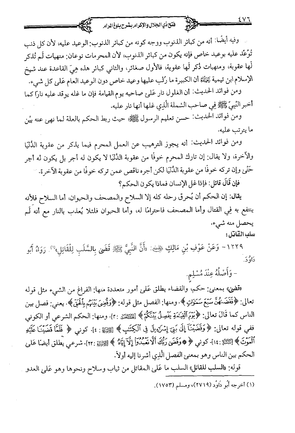1229 - وعن عوف بن مالك (رضي الله عنه) "أن النبي (صلى الله عليه وسلم) قضي بالسلب للقاتل" رواه أبو داود.
