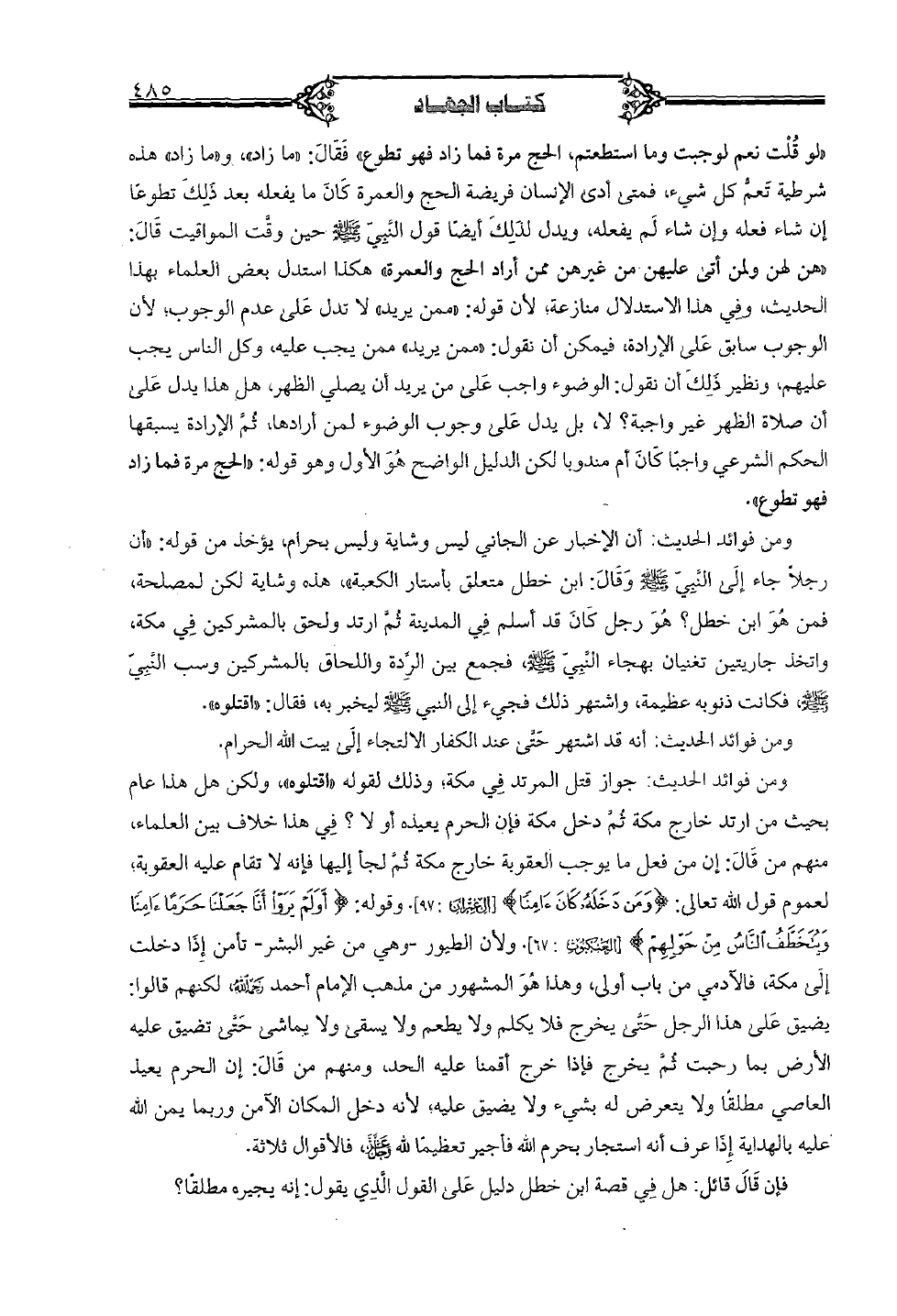 ومن فوائد الحديث: جواز قتل المرتد في مكة، وذلك لقوله "اقتلوه" ولكن هل هذا عام بحيث من ارتد خارج مكة ثم دخل مكة فإن الحرم يعيده أو لا؟ في هذا خلاف بين العلماء، منهم من قال: إن من فعل ما يوجب خارج مكة ثم لجأ إليها فإنها لا تقام عليه العقوبة، لعموم قوله الله تعالى: {ومن دخله كان أمنًا} [آل عمران: 97]، وقوله: {أو لم يروا أن جعلنا حرمًا أمنًا ويتخطف الناس من حولهم} [العكنبوت: 67] ولأن الطيور- وهي من غير البشر- تأمن إذا دخلت إلى مكة، فالآمي من باب أولى، وهذا هو المشهور من مذهب الإمام أحمد (رحمه الله)، لكنهم قالوا: يضيق على هذا الرجل حتى يخرج فلا يكلم ولا يطعم ولا يسقي ولا يماشي حتى تضيق عليه الأرض بما رحبت ثم يخرج فإذا خرج أقمنا عليه الحد، ومنهم من قال: إن الحرم يعيد العاصي مطلقًا ولا يتعرض له بشيء ولا يضيق عليه؛ لأنه دخل المكان الآمن وربما يمن الله عليه بالهداية إذا عرف أنه استجار بحرم الله فأجير تعظيمًا لله (عز وجل) فالأقوال ثلاثة.