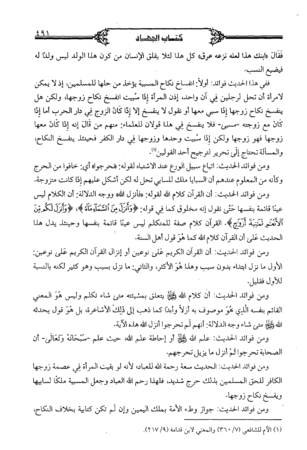ومن فوائد الحديث: الحديث سعة رحمه الله للعباد، لأنه لو بقيت المرأة في عصمة زوجها الكافر للحق المسلمين بذلك حرج شديد، فلهذا رحم الله العباد وجعل المسبية ملكًا لسابيها ويفسخ نكاح زوجها.